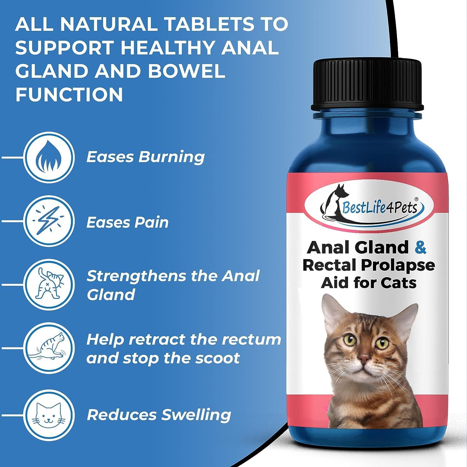 SUPPORT CAT ANAL GLANDS: End the straining during pregnancy labor and pushing to poop with a natural solution that goes deeper than just a lax fiber chew or salmon oil. BestLife4Pets Rectal Prolapse remedy, eases butt itching and reduces swelling around the anus allowing cats to push and poop without painEASES BURNING AND PAIN: Constipation, incomplete bowel movements, and even parasites can cause your feline to have abdominal pain, fecal incontinence - leakage of mucus, stool, and even bleeding from the rectum. Relieve their pain and discomfort with a natural plant based formula that also strengthens the anal gland and restores elasticity to help retract the rectum safely100% NATURAL WITH NO SIDE EFFECTS: Our top quality homeopathic anal gland support treatment has no artificial ingredients or flavors so it won't leave you dealing with painful side-effects like upset stomach, vomiting, or diarrhea. Safe for all felines senior to kitty, feral and even pregnant cats; our rectal prolapse remedy can be used safely with other cat vitamins or medsEASY, NO FUSS TABLETS: Finicky felines can smell flavored, smelly chews and fish oils a mile away so give your kitty an anal gland support supplement for cats that your pet will actually take without a struggle or fight. These tiny pellets dissolve quickly, have No Odor, and leave No Bad Taste so it is easy to hide them in cat food or favorite treats!