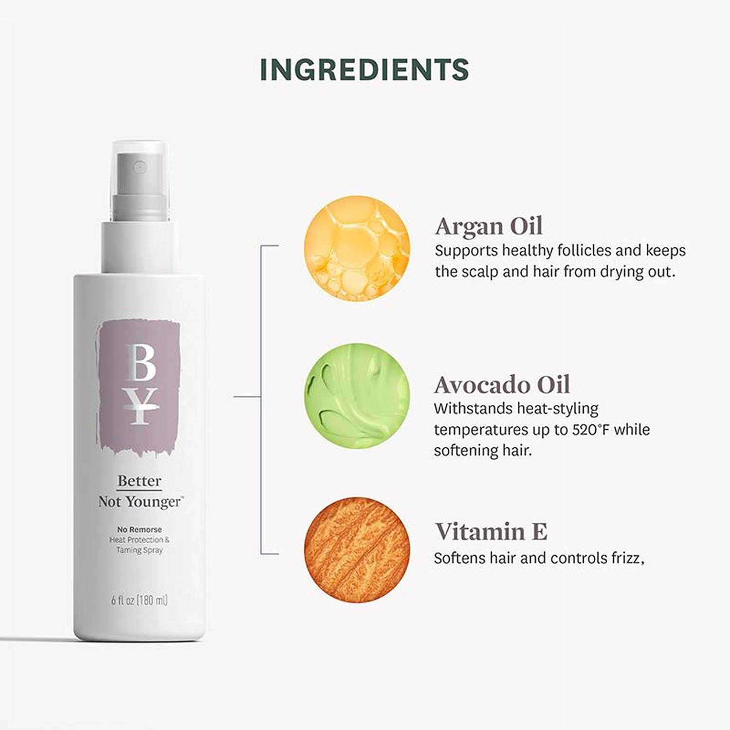 About this item NO REMORSE: Incredible heat protection meets miracle-moisturizing mist. Our proprietary blend of vitamin E and nourishing oils shields and conditions dry strands from damage caused by heat while taming frizz. KEY BENEFITS: Forms a protective layer around dry, dull strands and smoothes the cuticle to shield hair from damage caused by heat styling. Helps reduces breakage from hot styling tools like blow-dryers, curling irons and flat irons. Conditions hair while taming frizz and flyaways anytime throughout the day. INGREDIENTS: Argan Oil, Avocado Oil, and Vitamin E; It is rich in natural fatty acids with a smoke point of 520°F/271°C, it can withstand the temperatures from a flat iron that can also help support hair follicle health and maintain scalp and hair from drying out. HOW TO USE: Apply to damp or dry hair, hold spray 6-8 inches away and spray lightly, or spray directly into palms and manually coat mid-lengths and ends. Brush through hair to evenly distribute, style as usual and reapply throughout the day as needed to add back moisture and control frizz. At Better Not Younger we’re on a mission to change the industry, that's why all of our products are paraben-free, sulfate-free or SLS-free, and cruelty-free. See more product details,NO REMORSE: Incredible heat protection meets miracle-moisturizing mist. Our proprietary blend of vitamin E and nourishing oils shields and conditions dry strands from damage caused by heat while taming frizz,KEY BENEFITS: Forms a protective layer around dry, dull strands and smoothes the cuticle to shield hair from damage caused by heat styling. Helps reduces breakage from hot styling tools like blow-dryers, curling irons and flat irons. Conditions hair while taming frizz and flyaways anytime throughout the day,INGREDIENTS: Argan Oil, Avocado Oil, and Vitamin E; It is rich in natural fatty acids with a smoke point of 520°F/271°C, it can withstand the temperatures from a flat iron that can also help support hair follicle health and maintain scalp and hair from drying out,HOW TO USE: Apply to damp or dry hair, hold spray 6-8 inches away and spray lightly, or spray directly into palms and manually coat mid-lengths and ends. Brush through hair to evenly distribute, style as usual and reapply throughout the day as needed to add back moisture and control frizz,At Better Not Younger we’re on a mission to change the industry, that's why all of our products are paraben-free, sulfate-free or SLS-free, and cruelty-free