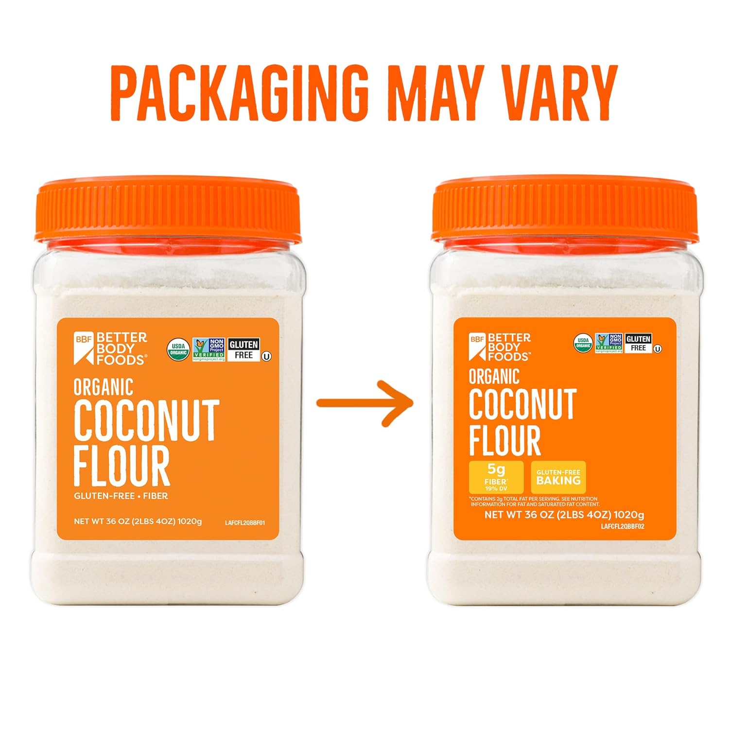 About this item A BETTER CHOICE: Gluten-free and lightly textured, BetterBody Foods Organic Coconut Flour makes for a delicious alternative to standard grain-based flours. With 23% dietary fiber per serving, coconut flour is a great choice for low carb and paleo diets GO NUTS FOR COCONUT: Our Organic Coconut Flour is made from ground coconut, so it retains some beneficial coconut oil and doesn't promote digestive distress like white flour can. With a slight coconut flavor, it brightens any recipe with tropical flavor BAKING, MADE BETTER: With a light coconut aroma and flavor, BetterBody Foods Organic Coconut Flour is ideal for baking moist and delicious muffins, quick breads and brownies. Try substituting it for 20%-100% of wheat flour in your favorite baking recipes CLEAN + TASTY: BetterBody Foods is committed to certified organic foods made with ingredients you can pronounce. Gluten-free, dairy-free, soy-free, but not taste-free, because even clean eating people have taste buds EDUCATE YOUR TASTEBUDS: BetterBody Foods products combine nutritious ingredients with delicious flavor › See more product details,A BETTER CHOICE: Gluten-free and lightly textured, BetterBody Foods Organic Coconut Flour makes for a delicious alternative to standard grain-based flours. With 23% dietary fiber per serving, coconut flour is a great choice for low carb and paleo diets,GO NUTS FOR COCONUT: Our Organic Coconut Flour is made from ground coconut, so it retains some beneficial coconut oil and doesn't promote digestive distress like white flour can. With a slight coconut flavor, it brightens any recipe with tropical flavor,BAKING, MADE BETTER: With a light coconut aroma and flavor, BetterBody Foods Organic Coconut Flour is ideal for baking moist and delicious muffins, quick breads and brownies. Try substituting it for 20%-100% of wheat flour in your favorite baking recipes,CLEAN + TASTY: BetterBody Foods is committed to certified organic foods made with ingredients you can pronounce. Gluten-free, dairy-free, soy-free, but not taste-free, because even clean eating people have taste buds,EDUCATE YOUR TASTEBUDS: BetterBody Foods products combine nutritious ingredients with delicious flavor