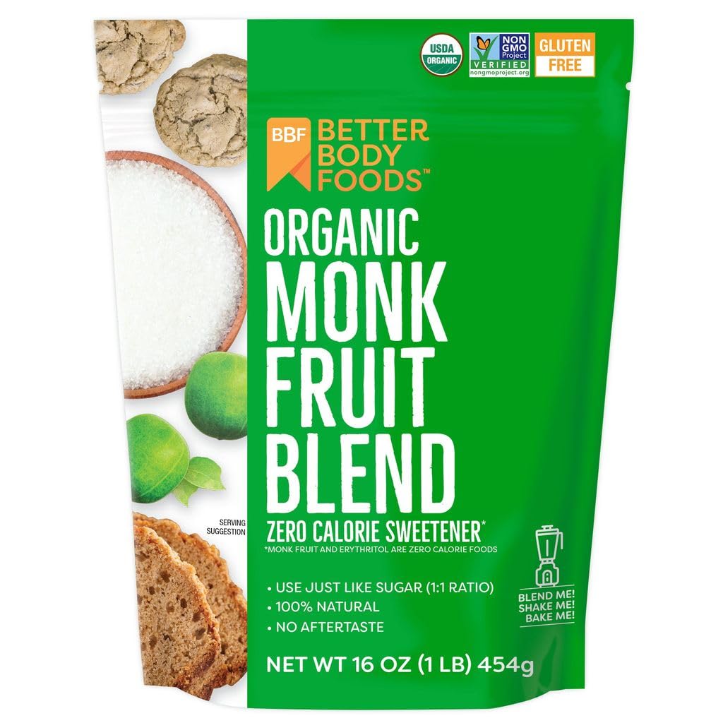BetterBody Foods Organic Monk Fruit Sweetener is a zero-calorie, sugar-free substitute that has no aftertaste. If you are on a sugar-free diet or if you are just trying to eat better but can't resist the delicious taste of sugar, Organic Monk Fruit Sweetener Blend is the perfect low-glycemic option for you. Monk fruit is an exotic fruit originating from the southern mountains of Asia. Our sweetener blend is made by first extracting the juice from the flesh of the monk fruit and then processing this juice to extract the sweet flavor. Finally, the sweet, extracted monk fruit is then blended with erythritol to match the sweetness and 1:1 ratio of sugar. You can use this sweetener in any situation in which you would use traditional sugar. You can use it when baking tasty confections like pie, cake, muffins, cobbler, souffles, cookies, brownies, and other desserts. You can even use it like regular table sugar to top your grapefruit for breakfast or add it to your morning coffee to counterbalance the bitterness. Try adding it to your protein or wellness shakes for an added hint of flavor. With BetterBody Foods' Organic Monk Fruit Sweetener Blend, you can have all the sweetness you can handle without the calories!,SUGAR SUBSTITUTE: This low-glycemic Organic Monk Fruit Sweetener Blend is the perfect way to add sweet flavor to any recipe or beverage. This preservative free sweetener tastes great in coffee, lemonade, and tea!,SWEET WITHOUT THE GUILT: This sugar alternative contains a mix of erythritol and monk fruit that imitates the sweetness of sugar but contains zero calories, so you won't be cheating on your diet,USE LIKE SUGAR: Our Organic Monk Fruit Sweetener Blend is the perfect ingredient to add to your pantry. Use it just like sugar (1:1 ratio) in your favorite baking recipes, smoothie mixes, and more,ORGANIC INGREDIENTS: We designed this tasty substitute to be organic, gluten-free and non-GMO. In addition, it is low-glycemic, so it won't spike your blood sugar levels or result in an energy crash,BETTERBODY FOODS: We are committed to providing you with better food choices because we believe that the journey to a better life starts with better food