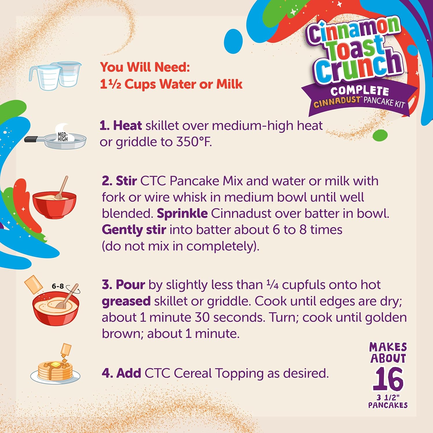 Betty Crocker Cinnamon Toast Crunch Pancakes Make It Easy To Add Cinnamon-Flavored Fun To Your Family'S Morning. This Complete Pancake Kit Includes Pancake Mix, Cinnadust And Cinnamon Toast Crunch Cereal Topping. Just Add Water Or Milk. Best Of All, This Betty Crocker Baking Mix Goes From Bowl To Skillet In Minutes For That Homemade Pancake Experience. This Pancake Mix Is Great For Tasty Birthday Breakfasts Or Anytime You Want A Special Recipe Without The Fuss. For More Than A Century, Betty Crocker Has Been A Popular Creator Of Simple, Delicious Recipes. Today, The Betty Crocker Kitchen Is Still Providing Convenient, Tasty Dessert Mixes, Frostings, And Convenient Meal Options And Side Dishes. And Today, You Can Still Find That Same Simple Goodness — Those Same Products You Grew Up With — On Grocery Shelves Around The World