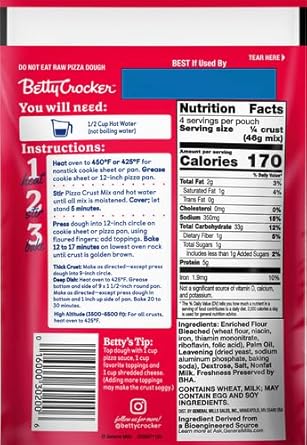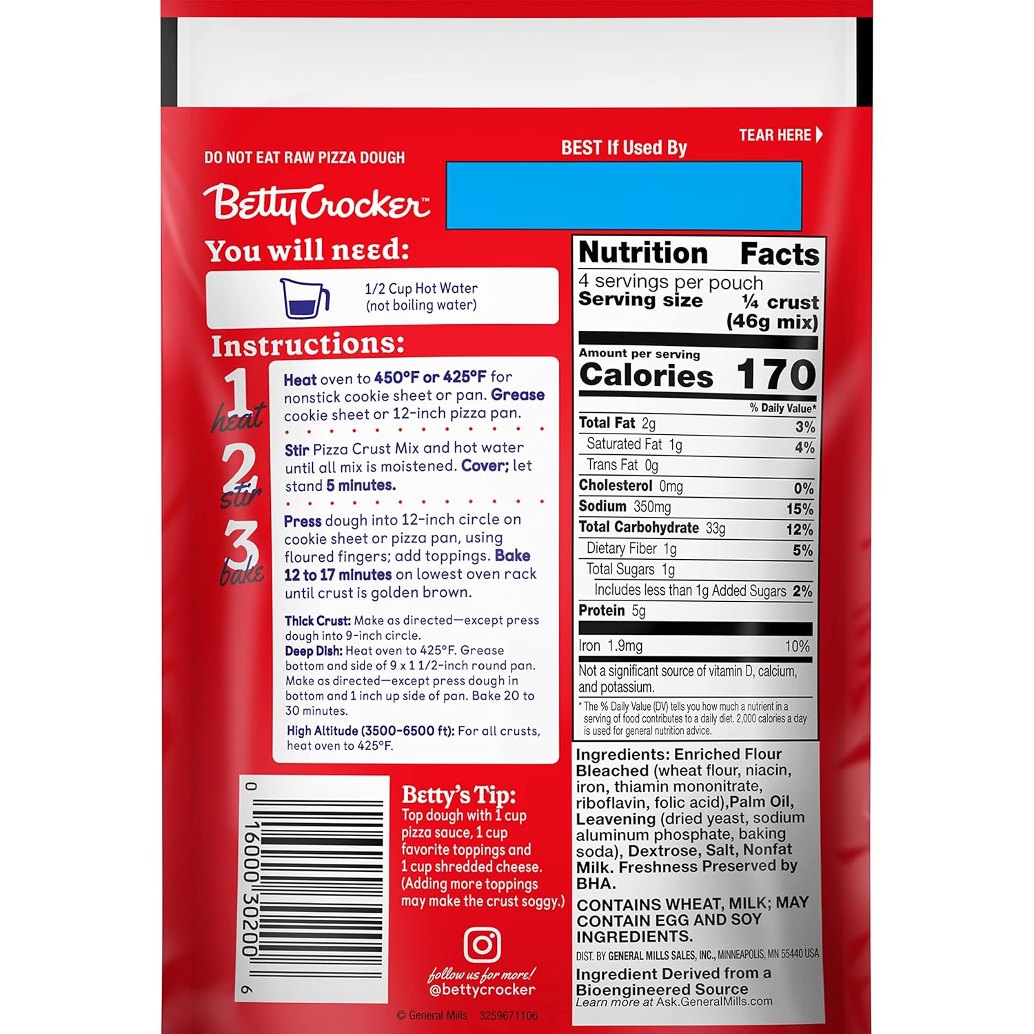Do Pizza Night At Home With Betty Crocker Pizza Crust Mix. It Helps Make The Perfect Pizza Dough Every Time With This Easy-To-Use Mix. Just Add Hot Water To Pizza Crust Mix, Let Rest For Five Minutes, Add Toppings And Bake! Your Family Will Enjoy Delicious Pizza In Under 30 Minutes. Customize Your Pizza Pie With Cheese, Veggies, Meats And More! Each 6.5-Ounce Bag Of Pizza Crust Mix Makes One 12-Inch Pizza Crust. For More Than A Century, Betty Crocker Has Been A Popular Creator Of Easy, Delicious Recipes. Today, The Betty Crocker Kitchen Is Still Providing Convenient, Tasty Dessert Mixes, Frostings, And Convenient Meal Options And Side Dishes. And Today, You Can Still Find Those Same Products You Grew Up With On Grocery Shelves