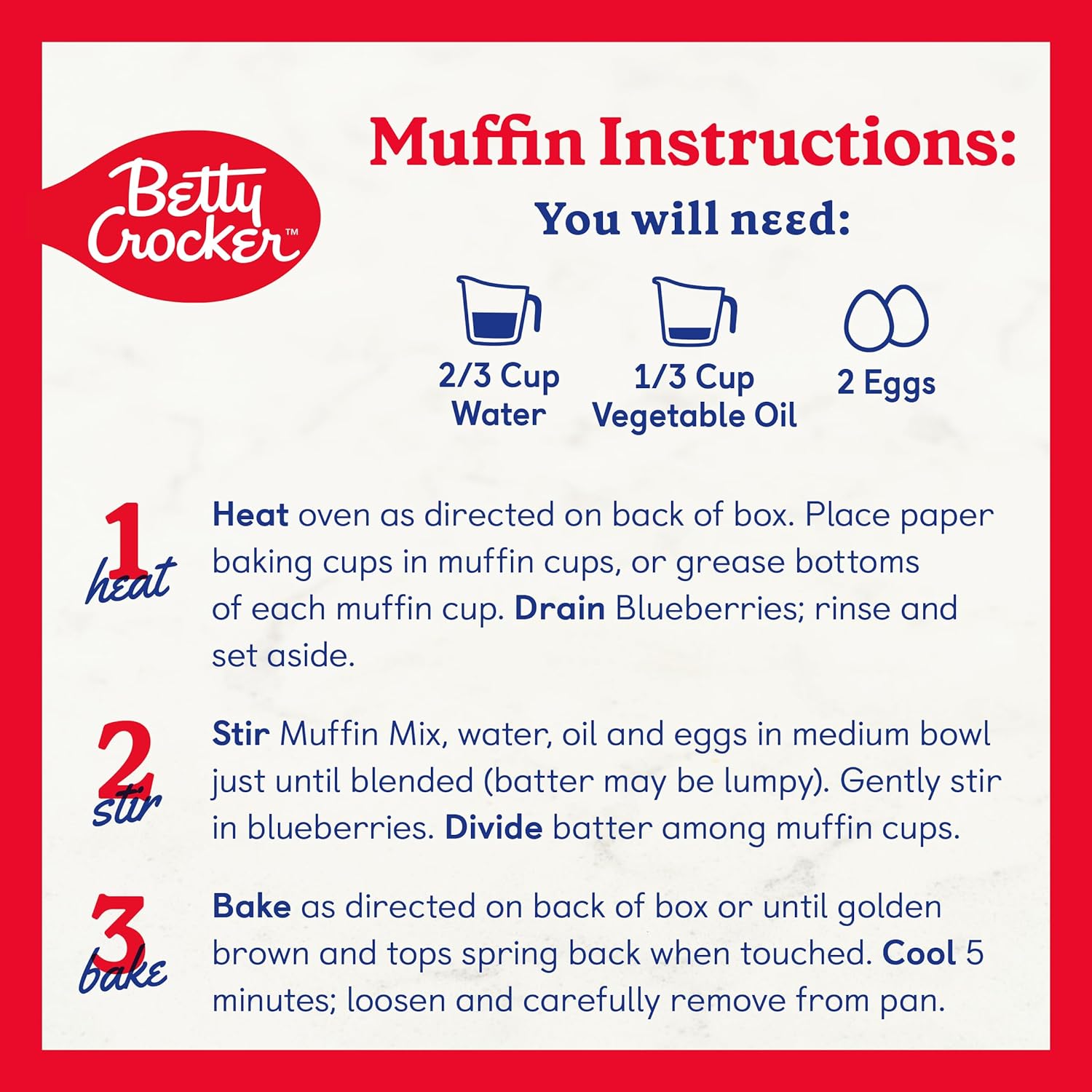 Fresh, Fluffy Blueberry Muffins Have Never Been Easier. Just Add Water, Oil And Eggs, Bake And Enjoy! With Betty Crocker Wild Blueberry Muffin & Bread Mix, A Home-Baked Blueberry Sensation Is Just Minutes Away. Use The Baking Mix As Is For An Easy Breakfast Or Snack Or Explore Betty Crocker Recipes For A New Take On This Classic Treat To Fill Your Home With The Delicious Scent Of Blueberry Muffins. For More Than A Century, Betty Crocker Has Been A Popular Creator Of Simple, Delicious Recipes. Today, The Betty Crocker Kitchen Is Still Providing Convenient, Tasty Dessert Mixes, Frostings, And Convenient Meal Options And Side Dishes. And Today, You Can Still Find That Same Simple Goodness β Those Same Products You Grew Up With β On Grocery Shelves Around The World
