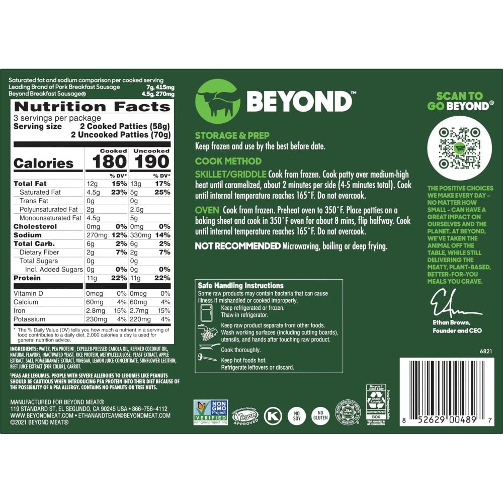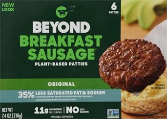About this item A BETTER BREAKFAST: these hearty plant-based breakfast sausage patties are juicy, packed with protein, and go from frozen to cooked in 5 minutes EXCELLENT SOURCE OF PROTEIN: 11 grams of plant-based protein per serving from peas and brown rice to power your day. See nutrition panel for fat, sat fat and sodium content. MADE TO POWER YOUR DAY: 35% less saturated fat and sodium per serving than a leading brand of pork sausage LESS IS MORE: made with simple, plant-based ingredients with no GMOs, soy or gluten. All of Beyond Meat products are vegan, kosher and have no antibiotics or hormones 6 PLANT-BASED PATTIES PER BOX: frozen and ready to cook. You do the rise, these do the shine See more product details,A BETTER BREAKFAST: these hearty plant-based breakfast sausage patties are juicy, packed with protein, and go from frozen to cooked in 5 minutes,EXCELLENT SOURCE OF PROTEIN: 11 grams of plant-based protein per serving from peas and brown rice to power your day. See nutrition panel for fat, sat fat and sodium content,MADE TO POWER YOUR DAY: 35% less saturated fat and sodium per serving than a leading brand of pork sausage,LESS IS MORE: made with simple, plant-based ingredients with no GMOs, soy or gluten. All of Beyond Meat products are vegan, kosher and have no antibiotics or hormones,6 PLANT-BASED PATTIES PER BOX: frozen and ready to cook. You do the rise, these do the shine
