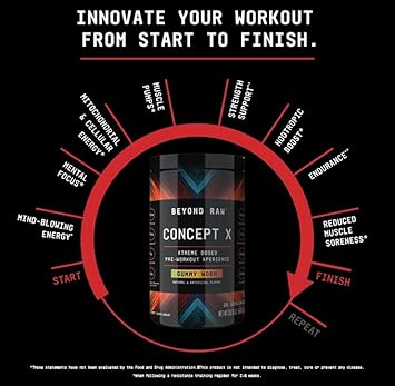 About this item A Pre-Workout Xperience Like Nothing You’ve Imagined. Be ready to push your body’s limits of energy, strength, endurance, pumps and focus. BEYOND RAW Concept X is a first-of-its-kind pre-workout, meticulously engineered to support the demands of next-level training and reduce exercise-related muscle soreness. Power Your Longest Sessions In The Gym. Get up and grind all morning—or stay after it into the night. Concept X pre-workout powder delivers 300mg of caffeine to fuel energy and endurance, including 50mg of Xtenergy P2 targeted-release caffeine for added nootropic benefits*. Extended workouts can also be derailed by the burning feeling of lactic acid buildup in muscles, so Concept X features 6.4g of CarnoSyn beta-alanine to increase a critical fatigue-controlling and performance factor. Superior Enhancement For Xtreme Lifting Days. Pre-workouts with creatine are standard for intense strength training, but Concept X combines the powerful benefits of 5g of creatine monohydrate with muscle strength acceleration from 325mg of MyoTOR. MyoTOR is clinically proven to improve muscle strength and researchers found it accelerated the results of training with just half the exercise. Dominate Days Off With Soreness Support And More. The hours between workouts are as important as the ones spent in the gym. It’s not just the reps you’re putting up—rebuilding and recovering are key to achieving maximum gains. Concept X can help supercharge your recovery time with Rephyll, a blend of turmeric and black pepper shown to reduce the discomfort associated with delayed onset muscle soreness. Provides 16 clinically dosed ingredients, including 300mg caffeine, 5g creatine monohydrate, 6.4g CarnoSyn beta-alanine, 10g citrulline malate + citrulline, 325mg MyoTOR, 500mg Rephyll See more product details,A Pre-Workout Xperience Like Nothing You’ve Imagined. Be ready to push your body’s limits of energy, strength, endurance, pumps and focus. BEYOND RAW Concept X is a first-of-its-kind pre-workout, meticulously engineered to support the demands of next-level training and reduce exercise-related muscle soreness,Power Your Longest Sessions In The Gym. Get up and grind all morning—or stay after it into the night. Concept X pre-workout powder delivers 300mg of caffeine to fuel energy and endurance, including 50mg of Xtenergy P2 targeted-release caffeine for added nootropic benefits*. Extended workouts can also be derailed by the burning feeling of lactic acid buildup in muscles, so Concept X features 6.4g of CarnoSyn beta-alanine to increase a critical fatigue-controlling and performance factor,Superior Enhancement For Xtreme Lifting Days. Pre-workouts with creatine are standard for intense strength training, but Concept X combines the powerful benefits of 5g of creatine monohydrate with muscle strength acceleration from 325mg of MyoTOR. MyoTOR is clinically proven to improve muscle strength and researchers found it accelerated the results of training with just half the exercise,Dominate Days Off With Soreness Support And More. The hours between workouts are as important as the ones spent in the gym. It’s not just the reps you’re putting up—rebuilding and recovering are key to achieving maximum gains. Concept X can help supercharge your recovery time with Rephyll, a blend of turmeric and black pepper shown to reduce the discomfort associated with delayed onset muscle soreness,Provides 16 clinically dosed ingredients, including 300mg caffeine, 5g creatine monohydrate, 6.4g CarnoSyn beta-alanine, 10g citrulline malate + citrulline, 325mg MyoTOR, 500mg Rephyll