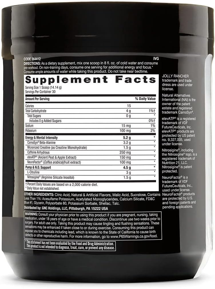 ABOUT THE PRODUCT: Beyond Raw LIT’s clinically dosed pre-workout powder for men and women helps you train with focus, intensity and pumpsPOWER THROUGH YOUR DAY: Enjoy additional energy and focus on both training and non-training days when you incorporate Beyond Raw LIT into your daily routinePEAK PERFORMANCE: Contains 1.5g of Nitrosigine, 3g of L-Citrulline, 3g of CarnoSyn Beta-Alanine and 250mg of caffeine per serving to support nitric oxide production, energy, and mental intensityFORMULATION: Enjoy the benefits of enhanced energy and performance with a gluten-free and sugar-free formulaABOUT THE BRAND: For over 85 years, GNC has been the leading the way in global health and wellness. GNC is committed to meeting the highest standards of quality, safety and efficacy while applying the most up-to-date advances in nutritional science. Whether you're just getting started, or you need to keep going, GNC is committed to sparking your motivation and supporting your desire to live well