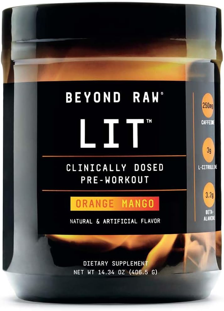 Beyond Raw Lit | Clinically Dosed Pre-Workout Powder | Contains Caffeine, L-Citrulline, Beta-Alanine, And Nitric Oxide | Orange Mango | 30 Servings