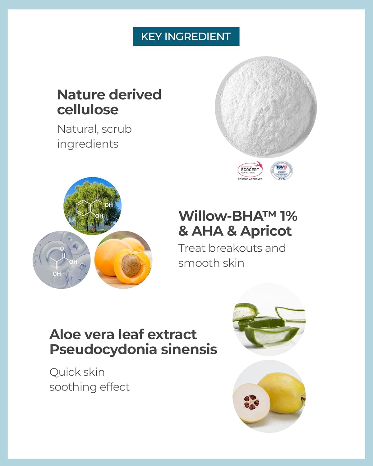 About this item RAPID AND EFFECTIVE EXFOLIATION: Experience fast and efficient exfoliation with the BHA+ Pore Zero 30 Second Exfoliator. This product combines plant-based cellulose and powerful exfoliants like Willow-BHA and AHA to control sebum and provide a quick, gentle peeling, transforming your skin in under a minute. ENRICHED WITH NATURAL EXTRACTS: Loaded with skin-soothing ingredients such as aloe vera and apricot extract, our exfoliator not only removes unwanted layers but also nourishes and calms the skin. This balanced blend is perfect for maintaining healthy, vibrant skin. SUITABLE FOR ALL SKIN TYPES: Our hypoallergenic, paraben-free formula makes this exfoliator ideal for everyone. Whether you have sensitive, dry, oily, or combination skin, you can benefit from this gentle yet effective exfoliation method without any irritation. HOW TO USE FOR BEST RESULTS: Ensure your face is dry after washing. Apply a small amount and gently massage all over the face, avoiding the eye and mouth areas. After 30 seconds, rinse thoroughly with lukewarm water to reveal a smoother and more radiant complexion. KOREAN HERITAGE, GLOBAL BEAUTY: Embodying the essence of Korean skincare, BE THE SKIN combines time-tested beauty traditions with modern science. Dedicated to clean and effective skincare, we harness the power of plant-based ingredients to formulate products that honor your skin's natural beauty and health. This commitment positions us at the forefront of global skincare innovation. โบ See more product details,RAPID AND EFFECTIVE EXFOLIATION: Experience fast and efficient exfoliation with the BHA+ Pore Zero 30 Second Exfoliator. This product combines plant-based cellulose and powerful exfoliants like Willow-BHA and AHA to control sebum and provide a quick, gentle peeling, transforming your skin in under a minute,ENRICHED WITH NATURAL EXTRACTS: Loaded with skin-soothing ingredients such as aloe vera and apricot extract, our exfoliator not only removes unwanted layers but also nourishes and calms the skin. This balanced blend is perfect for maintaining healthy, vibrant skin,SUITABLE FOR ALL SKIN TYPES: Our hypoallergenic, paraben-free formula makes this exfoliator ideal for everyone. Whether you have sensitive, dry, oily, or combination skin, you can benefit from this gentle yet effective exfoliation method without any irritation,HOW TO USE FOR BEST RESULTS: Ensure your face is dry after washing. Apply a small amount and gently massage all over the face, avoiding the eye and mouth areas. After 30 seconds, rinse thoroughly with lukewarm water to reveal a smoother and more radiant complexion,KOREAN HERITAGE, GLOBAL BEAUTY: Embodying the essence of Korean skincare, BE THE SKIN combines time-tested beauty traditions with modern science. Dedicated to clean and effective skincare, we harness the power of plant-based ingredients to formulate products that honor your skin's natural beauty and health. This commitment positions us at the forefront of global skincare innovation