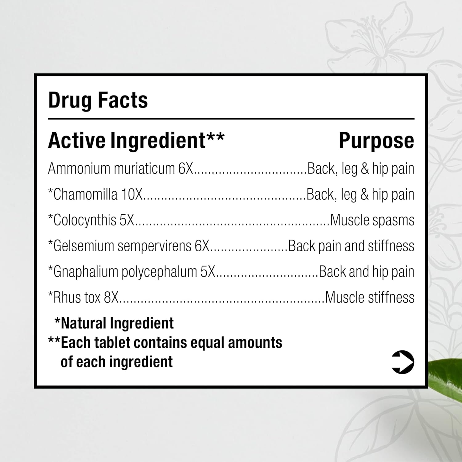 DESCRIPTION : BHI Back Natural Back, Hip & Leg Pain Relief - 6 Powerful Multi-Symptom Active Homeopathic Ingredients Help Calm Back Pain, Muscle Tightness & Spasms Naturally for Women & Men - 100 Tablets