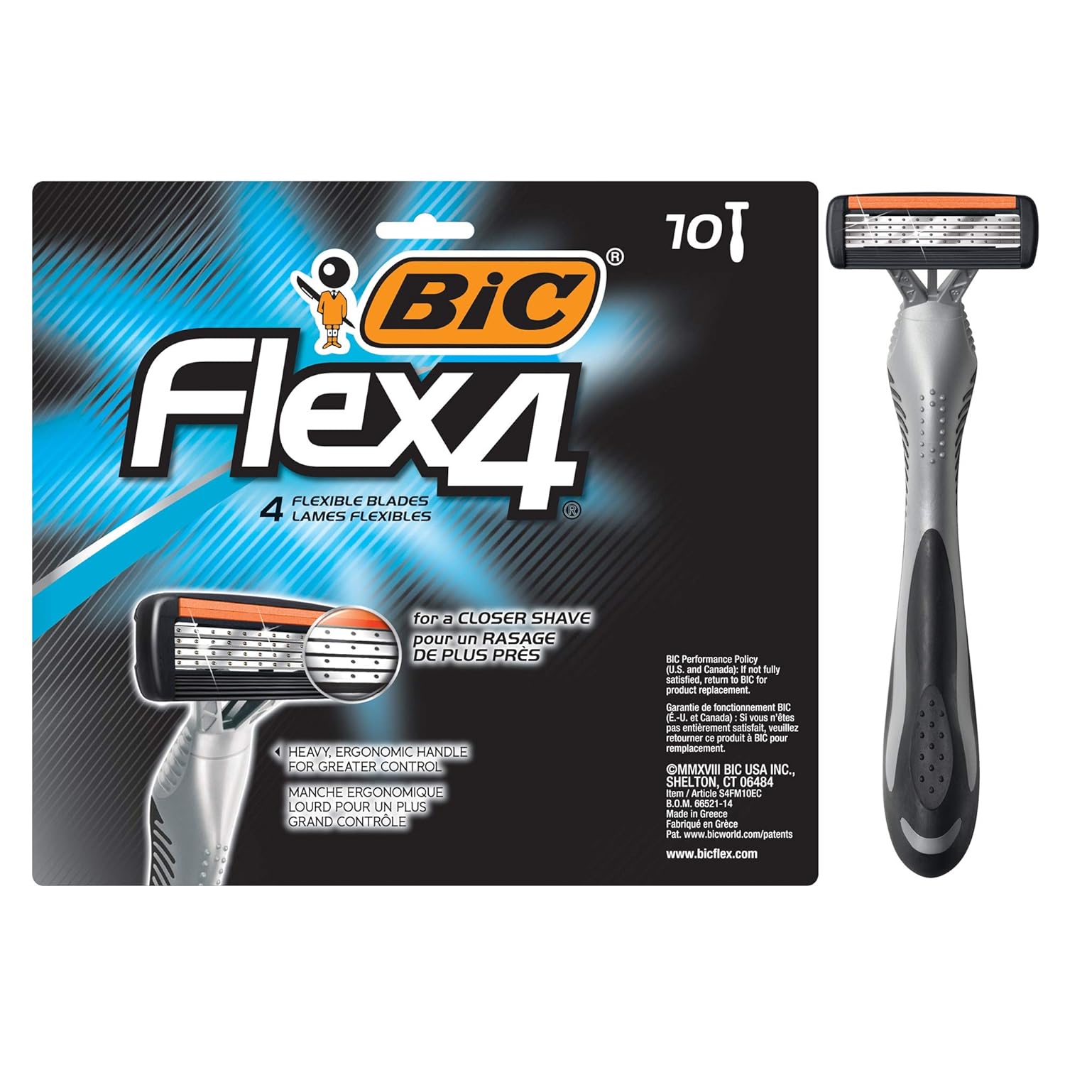 One 10 piece BIC Flex 4 Titanium Razor Kit for Men contains 10 disposable men's razorsDisposable razors with 4 Longer Lasting Flexible Blades *vs BIC SensitiveMen's disposable razor helps protect from irritation with features that include a lubricating strip, flexible blades, and pivoting headBIC razor for men has a lubricating strip enriched with Aloe Vera and Vitamin E for an enhanced glide while shaving30° pivoting disposable men's razor head to adjust to the contours of your faceBIC Flex4 Titanium Sensitive is a four-blade razor featuring longer-lasting flexible blades* that individually adjust to the contours of one's skin. These Titanium-coated blades have increased durability* and are ultra-thin, helping them stay sharp for many shaves. The Aloe Vera and Vitamin E enriched lubricating strip, flexible blade tech, and pivoting head help this sensitive skin razor protect from irritation. While the heavier handle with ergonomic form factor and cushion grip, give improved shave control*. *vs. BIC Sensitive