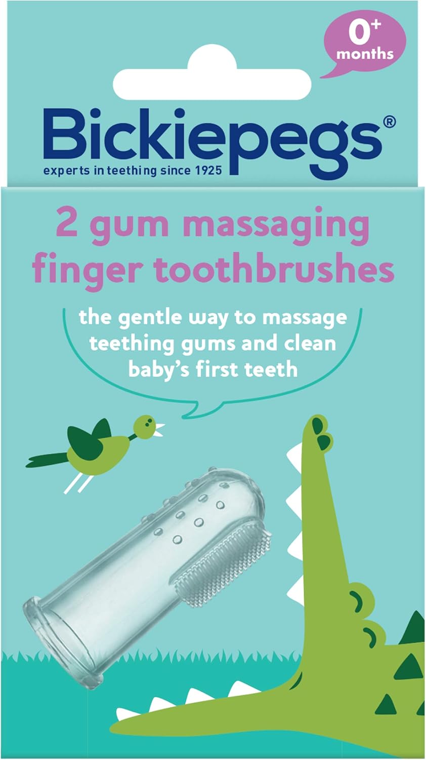 Product description Bickiepegs Baby Finger Toothbrush – Gentle oral care for your baby’s first teeth! Designed for easy handling by parents, this soft, silicone finger toothbrush effectively cleans baby gums and emerging teeth, promoting healthy oral hygiene habits. Ideal for sensitive gums during teething, it helps soothe discomfort while keeping your baby’s mouth clean. Perfect for ages 0-12 months. BPA-free and easy to clean. Directions Slip the brush over your finger for full control during brushing. Gently clean baby's gums and emerging teeth. Replace every 3 months or when bristles show signs of wear,Gentle Oral Care for Babies: Soft, flexible silicone bristles gently clean baby’s gums and first teeth, providing a comfortable brushing experience for ages 0-12 months,Promotes Healthy Oral Habits: Encourages early oral hygiene by making it easy for parents to clean and massage baby’s gums, reducing the risk of plaque buildup,Ideal for Teething Relief: The textured bristles soothe sore gums and help ease teething discomfort, making it a perfect companion during teething stages,BPA-Free & Safe for Babies: Made from 100% food-grade silicone, our finger toothbrush is safe for babies to use, free from harmful chemicals,Easy to Use & Clean: Simply slip the brush over your finger for full control during brushing. Dishwasher-safe for easy cleaning and reusable for daily care