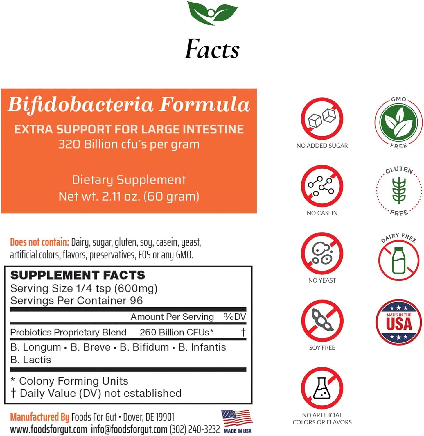 About this item Ingredients: B. Bifidum, B. Breve, B. Infantis, B. Lactis, B. Longum. Our probiotic powders are stored in our FDA-registered facility, ensuring strict control over product quality at every stage. We manage the entire process in-house, without relying on third-party warehouses. All products are sent directly from our facility, allowing us to oversee every detail and ensure prompt, reliable process to your doorstep. This hands-on approach reflects Foods For Gut's commitment to excellence and customer satisfaction. Natural Defense System: Our probiotic powder supports the body's natural defense system by facilitating a healthy gut microbiome, which plays a key role in immune function. Simply mix it with water, smoothies, or any preferred method. Regular use of our probiotic supports balanced digestion, boosts immunity, and can alleviate digestive discomfort. Ideal for those looking for an easy, effective way to improve their overall well-being and maintain a healthy gut. Quality & PURITY: This probiotic powder classifies purity by using high-quality ingredients and avoiding unnecessary additives. This single strain probiotic powder does not contain any dairy, sugar, gluten, soy, casein, yeast, artificial colors, flavors, preservatives, FOS or any GMO. By focusing purely on essential components and eliminating unnecessary excipients, this probiotic ensures maximum efficiency and a premium quality product that supports health and promotes overall wellness. Perfect for Any Lifestyle: Foods For Gut offers premium individual strains and exclusive multi-strain probiotic formulas that are professionally formulated and MADE IN THE USA. Each superior strain provides a range of benefits to maximize your needs and provide a stronger immune system. Adding probiotic supplements to your daily routine can support balanced digestion, boosts immunity, and can alleviate digestive discomfort. Ideal for those looking for an easy, effective way to improve their overall well-being and maintain a healthy gut. See more product details,Ingredients: B. Bifidum, B. Breve, B. Infantis, B. Lactis, B. Longum, Our probiotic powders are stored in our FDA-registered facility, ensuring strict control over product quality at every stage. We manage the entire process in-house, without relying on third-party warehouses. All products are sent directly from our facility, allowing us to oversee every detail and ensure prompt, reliable process to your doorstep. This hands-on approach reflects Foods For Gut's commitment to excellence and customer satisfaction, Natural Defense System: Our probiotic powder supports the body's natural defense system by facilitating a healthy gut microbiome, which plays a key role in immune function. Simply mix it with water, smoothies, or any preferred method. Regular use of our probiotic supports balanced digestion, boosts immunity, and can alleviate digestive discomfort. Ideal for those looking for an easy, effective way to improve their overall well-being and maintain a healthy gut, Quality & PURITY: This probiotic powder classifies purity by using high-quality ingredients and avoiding unnecessary additives. This single strain probiotic powder does not contain any dairy, sugar, gluten, soy, casein, yeast, artificial colors, flavors, preservatives, FOS or any GMO. By focusing purely on essential components and eliminating unnecessary excipients, this probiotic ensures maximum efficiency and a premium quality product that supports health and promotes overall wellness, Perfect for Any Lifestyle: Foods For Gut offers premium individual strains and exclusive multi-strain probiotic formulas that are professionally formulated and MADE IN THE USA. Each superior strain provides a range of benefits to maximize your needs and provide a stronger immune system. Adding probiotic supplements to your daily routine can support balanced digestion, boosts immunity, and can alleviate digestive discomfort. Ideal for those looking for an easy, effective way to improve their overall well-being and maintain a healthy gut