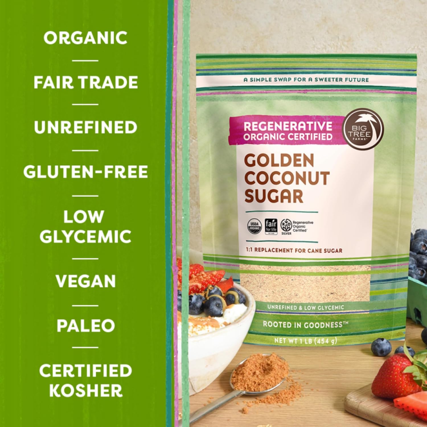 Big Tree Farms Organic Golden Coconut Sugar - Coconut Palm Sugar, Unrefined, Fine Crystals, Cane Sugar Replacement, Coconut Blossom Nectar, Vegan, Perfect For Baking - 1 Pound (Pack Of 1)