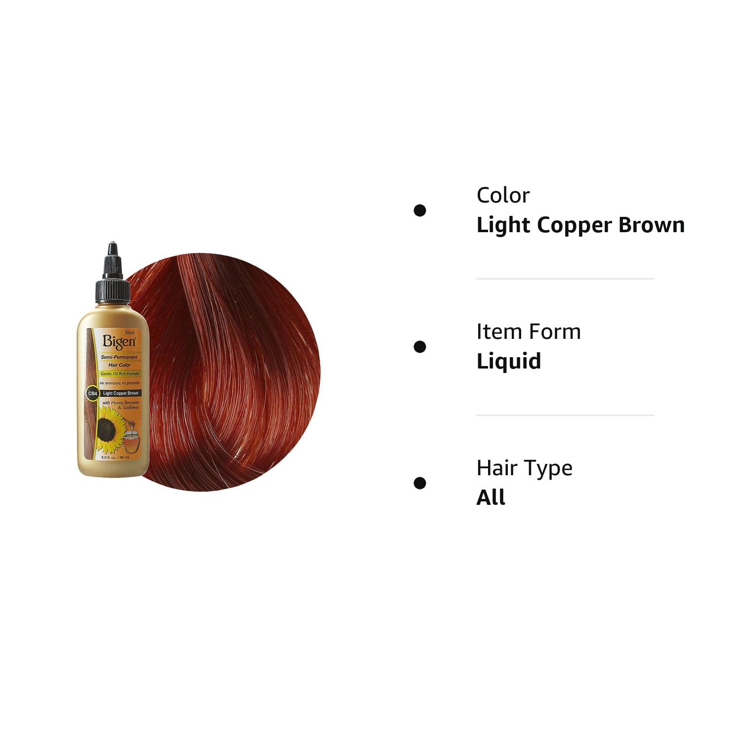 ABOUT THE PRODUCT: 1 > This product is Manufactured in United States 2 > This Product is Easy to use 3 > Bigen Semi Permanent Hair Color Light Copper Brown Provides Long-Lasting Color With Excellent Gray Hair Coverage Gentle, Oil-Rich Formula Contains No Ammonia Or Peroxide Nourishes Hair With Honey, Beeswax and Sunflower Leaves Hair Shiny, Soft And Beautiful Safe For All Hair Types