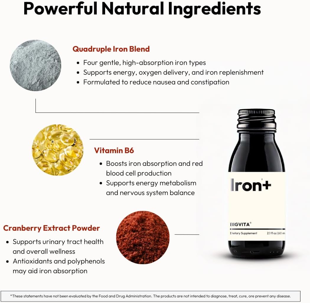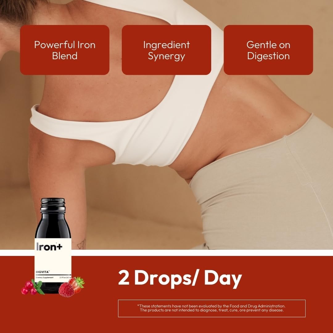 About this item Only 2 Drops a Day β Liquid Iron, Simplified: A powerful daily dose in just 2 tasteless drops. 1 bottle provides a full month of highly absorbable, gentle iron supplementation. Microencapsulated Iron β 5X Higher Bioavailability: Formulated with micronized ferric pyrophosphate (under 21?m) in microcapsules for superior absorption without stomach irritation or metallic aftertaste. No Metallic Taste, No GI Discomfort: Microencapsulation technology masks the typical iron taste and protects your digestive system from irritation, nausea, or constipation. Cranberry Extract β Feminine Health & Antioxidant Power: Includes 36mg of Type A Proanthocyanidins (PACs) from 360mg Cranberry Extract per serving β equivalent to the PACs found in 83x the volume of fresh cranberries β for urinary tract support and antioxidant protection. Folate & B6 β Supports Red Blood Cells & Hormonal Balance: Delivers both folate and vitamin B6 to aid in red blood cell formation, energy production, and female hormonal regulation. βΊ See more product details,Only 2 Drops a Day β Liquid Iron, Simplified: A powerful daily dose in just 2 tasteless drops. 1 bottle provides a full month of highly absorbable, gentle iron supplementation,Microencapsulated Iron β 5X Higher Bioavailability: Formulated with micronized ferric pyrophosphate (under 21?m) in microcapsules for superior absorption without stomach irritation or metallic aftertaste,No Metallic Taste, No GI Discomfort: Microencapsulation technology masks the typical iron taste and protects your digestive system from irritation, nausea, or constipation,Cranberry Extract β Feminine Health & Antioxidant Power: Includes 36mg of Type A Proanthocyanidins (PACs) from 360mg Cranberry Extract per serving β equivalent to the PACs found in 83x the volume of fresh cranberries β for urinary tract support and antioxidant protection,Folate & B6 β Supports Red Blood Cells & Hormonal Balance: Delivers both folate and vitamin B6 to aid in red blood cell formation, energy production, and female hormonal regulation