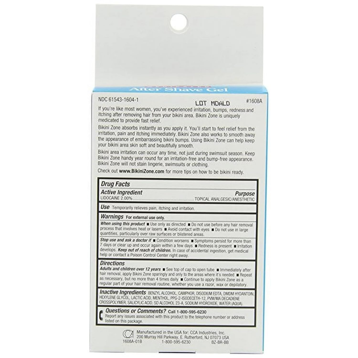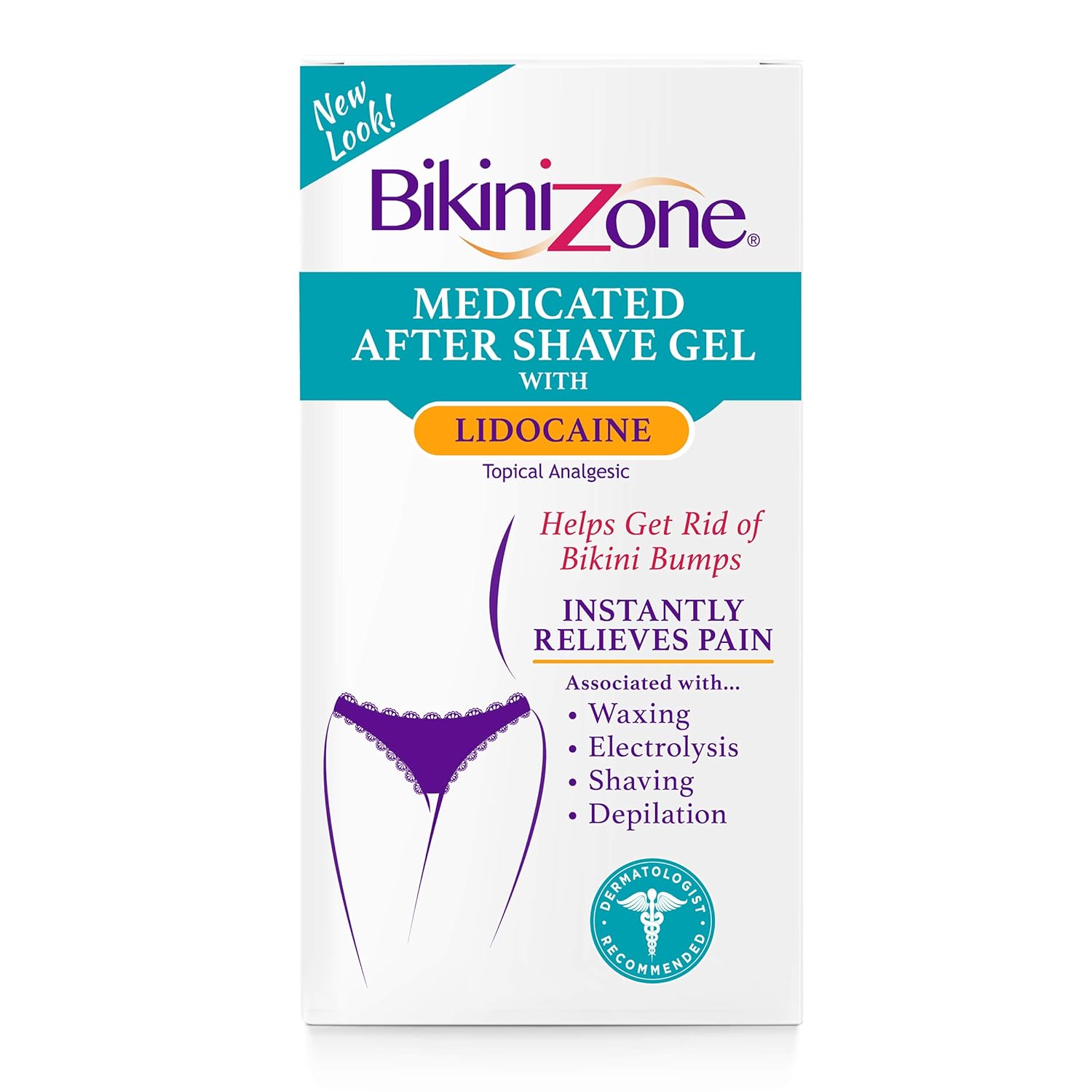 Lidocaine HCl 2% Numbs Irritation & Pain - Bikini Zone Medicated After Shave Gel uses 2% Lidocaine HCl as the main ingredient. This acts as the first line of relief for irritation from many forms of hair removal. Lidocaine provides temporary numbing relief to sensitive skin areasReduce Unsightly Shave Bumps - Bikini Zone Medicated After Shave Gel is formulated with salicylic acid and lactic acid to help reduce the appearance of unwanted shave bumps, irritation, and redness you can get after hair removal. Our medicated gel applies smoothly and absorbs quickly. With consistent use, you should notice smoother skin without bumps or irritationGentle, Cooling Relief - Bikini Zone Medicated After Shave Gel contains Menthol and Camphor to soothe sensitive skin after shaving, waxing, depilating, razor burn, or laser hair removal. The cooling sensation lets you know the gel is working and provides a refreshing feelingUse Our Dye Free Formula Safely Everyday - We don't use any dyes in Bikini Zone's Medicated After Shave Gel so you can be confident it won't stain your clothing or sheets. Apply the gel evenly to the area immediately following hair removal. It will absorb quickly and helps keep skin smooth all year long with consistent use