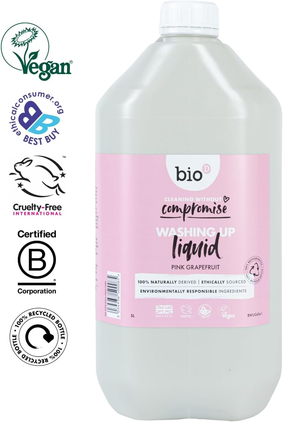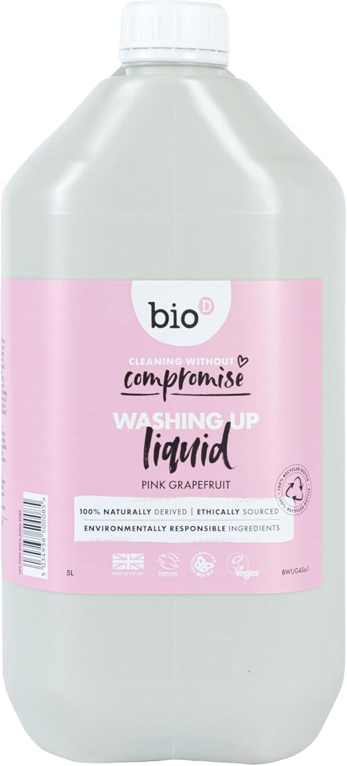 Product Description Bio-D is an independent, family-owned, ethically motivated company, dedicated to promoting the use of hypoallergenic, environmentally responsible detergents that have a minimum impact on the ecosystem both in their use and in their manufacturing process. Where possible, all raw materials are plant-derived and are obtained from renewable sources. We operate a strict policy whereby none of our raw materials or finished products are tested on animals. All bottles, containers and packaging contain optimum levels of recycled materials and are themselves recyclable. Ingredients Above 30% Anionic Surfactant. Below 5%: Non-ionic Surfactant, Sodium Chloride, Citric Acid, Citrus Grandis Peel oil. P.when('A').execute(function(A) { A.on('a:expander:toggle_description:toggle:collapse', function(data) { window.scroll(0, data.expander.$expander[0].offsetTop-100); }); }); Directions Please see product images (where applicable) or packaging Safety Warning Please see product images (where applicable) or packaging Box Contains Each order will arrive with 1 x Bio D Grapefruit Washing Up Liquid 5L See more,Natural Pink Grapefruit Fragrance: Infused with a blend of grapefruit and orange essential oils, it provides a refreshing and uplifting scent during dishwashing,Concentrated Formula: A small amount goes a long way; just 10-15ml (two teaspoons) is sufficient for an average bowl of washing up, ensuring economical use,Effective Cleaning Power: Tough on grease and burnt-on stains, making it excellent for everyday use while being gentle on your hands,Hypoallergenic and Skin-Friendly: 100% hypoallergenic, making it suitable for individuals with sensitive skin,Eco-Friendly Ingredients: Made from 100% naturally derived, plant-based ingredients, it's biodegradable and environmentally friendly,This washing up liquid combines effective cleaning power with a refreshing scent and environmental responsibility, making it a great choice for eco-conscious consumers