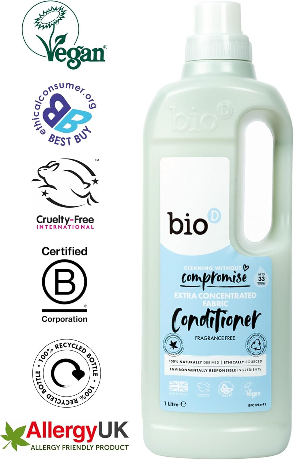 Product Description Formulated using plant-based derivatives as its main ingredients, Bio D Fabric Conditioner is fragrance free, hypoallergenic and is free from inorganic chemicals, enzymes or animal by-products. Suitable for hand washing or for washing machine use, this fabric conditioner is manufactured in the UK and provides clothes with a refreshing, static-free wash. Ingredients Aqua, Cationic Surfactant from Non-GM Rape Seed Oil, Ethanol. P.when('A').execute(function(A) { A.on('a:expander:toggle_description:toggle:collapse', function(data) { window.scroll(0, data.expander.$expander[0].offsetTop-100); }); }); Directions Add fabric conditioner to the washing machine after detergent and before clothes, or use as directed for specific washing machines or fabrics. See more,Concentrated Formula: Provides up to 33 washes per litre, offering an economical and efficient solution for softening your laundry,Fragrance-Free and Hypoallergenic: Accredited by Allergy UK, this conditioner is free from fragrances and enzymes, making it suitable for sensitive skin and those prone to allergies,Natural and Eco-Friendly: Made from 100% naturally derived, plant-based ingredients, it's vegan, cruelty-free, and packaged in 100% recyclable materials, minimizing environmental impact,Fabric Protection: Designed to protect fibers, leaving clothes soft, static-free, and easier to iron, enhancing the longevity and comfort of your garments,Suitable for Various Washing Methods: Ideal for use in automatic washing machines, twin-tubs, and for handwashing delicate fabrics, providing versatility across different laundry routines,This fabric conditioner combines effective softening capabilities with environmental responsibility, making it a great choice for eco-conscious consumers
