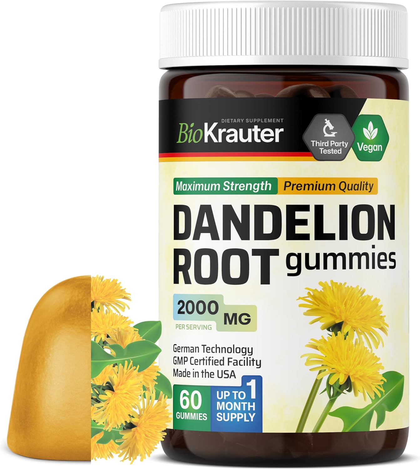 About this item Dandelion Gummies for Liver & Kidney: BioKrauter dandelion root supplement, made from Taraxacum officinale (commonly known as dandelion), provides an easy and pleasant way for liver and kidney support. Extracted from Nature: These Dandelion root extract gummies are formulated with pectin, ensuring they are vegan and non-GMO. They contain no artificial ingredients, colors, or flavors. Apple Flavor: BioKrauter dandelion extract gummies possess a natural apple taste, made without the inclusion of artificial flavors. German Technology: BioKrauter dandelion supplements are made using German methods. These gummies won't melt in the sun or your hands and won’t stick together. Usage Instructions: Administer the dandelion detox gummies as directed on the product label. Ensure to chew thoroughly before swallowing. › See more product details,Dandelion Gummies for Liver & Kidney: BioKrauter dandelion root supplement, made from Taraxacum officinale (commonly known as dandelion), provides an easy and pleasant way for liver and kidney support,Extracted from Nature: These Dandelion root extract gummies are formulated with pectin, ensuring they are vegan and non-GMO. They contain no artificial ingredients, colors, or flavors,Apple Flavor: BioKrauter dandelion extract gummies possess a natural apple taste, made without the inclusion of artificial flavors,German Technology: BioKrauter dandelion supplements are made using German methods. These gummies won't melt in the sun or your hands and won’t stick together,Usage Instructions: Administer the dandelion detox gummies as directed on the product label. Ensure to chew thoroughly before swallowing