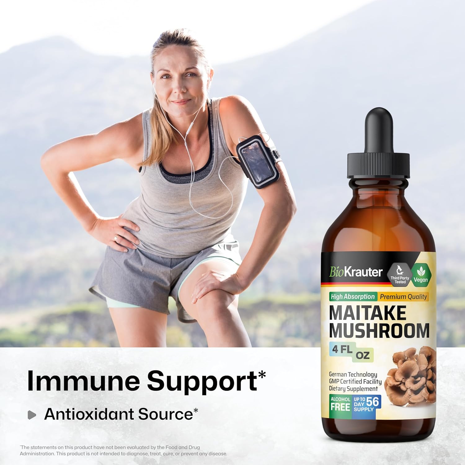 About this item Maitake Tincture for Immunity: BioKrauter maitake mushroom extract, made from Grifola frondosa (commonly known as maitake), supports immunity. Vegan & Non-alcohol: Our maitake mushroom tincture is vegan, non-GMO, and free from alcohol, artificial colors, and flavors, designed to align with a wide range of lifestyles. No Bitter Taste: Our maitake liquid supplement is crafted with glycerin, which naturally eliminates bitterness, ensuring a smooth and pleasant flavor without the need for any added sugars. German Technology: We utilize German technology to craft maitake supplement that naturally and effectively supports immunity. Made with only three simple ingredients: water, glycerin, and maitake mushroom—this formula provides up to 98% absorption. Usage Instructions: Shake well before use. Our maitake mushroom supplement is easy to use—simply add a few maitake drops to your favorite beverage or directly under the tongue. Avoid touching the dropper with your lips or tongue. › See more product details,Maitake Tincture for Immunity: BioKrauter maitake mushroom extract, made from Grifola frondosa (commonly known as maitake), supports immunity,Vegan & Non-alcohol: Our maitake mushroom tincture is vegan, non-GMO, and free from alcohol, artificial colors, and flavors, designed to align with a wide range of lifestyles,No Bitter Taste: Our maitake liquid supplement is crafted with glycerin, which naturally eliminates bitterness, ensuring a smooth and pleasant flavor without the need for any added sugars,German Technology: We utilize German technology to craft maitake supplement that naturally and effectively supports immunity. Made with only three simple ingredients: water, glycerin, and maitake mushroom—this formula provides up to 98% absorption,Usage Instructions: Shake well before use. Our maitake mushroom supplement is easy to use—simply add a few maitake drops to your favorite beverage or directly under the tongue. Avoid touching the dropper with your lips or tongue
