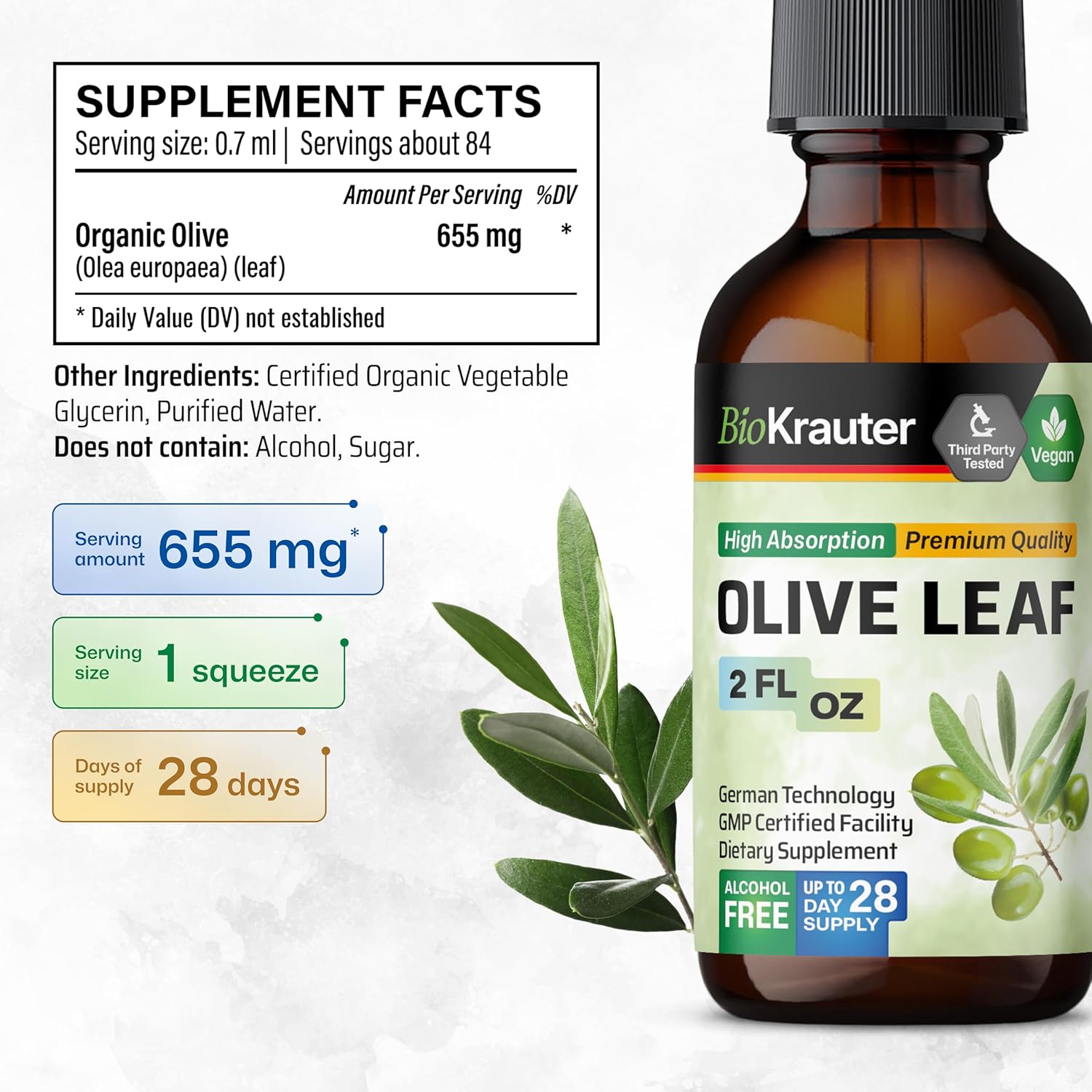 About this item Oleuropein Olive Extract Leaf Liquid for Overall Health: BioKrauter olive leafe extract, made from Olea europaea (commonly known as olive leaf), supports overall health. Vegan & Non-alcohol: Our olive leaves extract formula is vegan, non-GMO, and free from alcohol, artificial colors, and flavors, designed to align with a wide range of lifestyles. No Bitter Taste: Our oleuropein liquid is crafted with glycerin, which naturally eliminates bitterness, ensuring a smooth and pleasant flavor without the need for any added sugars. German Technology: We utilize German technology to craft olive leave extract liquid that naturally and effectively supports your health. Made with only three simple ingredients: water, glycerin, and leaf oliveāthis formula provides up to 98% absorption. Usage Instructions: Shake well before use. Our olive leaf liquid extract is easy to useāsimply add a few olive tree extract drops to your favorite beverage or directly under the tongue. Avoid touching the dropper with your lips or tongue. āŗ See more product details,Oleuropein Olive Extract Leaf Liquid for Overall Health: BioKrauter olive leafe extract, made from Olea europaea (commonly known as olive leaf), supports overall health,Vegan & Non-alcohol: Our olive leaves extract formula is vegan, non-GMO, and free from alcohol, artificial colors, and flavors, designed to align with a wide range of lifestyles,No Bitter Taste: Our oleuropein liquid is crafted with glycerin, which naturally eliminates bitterness, ensuring a smooth and pleasant flavor without the need for any added sugars,German Technology: We utilize German technology to craft olive leave extract liquid that naturally and effectively supports your health. Made with only three simple ingredients: water, glycerin, and leaf oliveāthis formula provides up to 98% absorption,Usage Instructions: Shake well before use. Our olive leaf liquid extract is easy to useāsimply add a few olive tree extract drops to your favorite beverage or directly under the tongue. Avoid touching the dropper with your lips or tongue