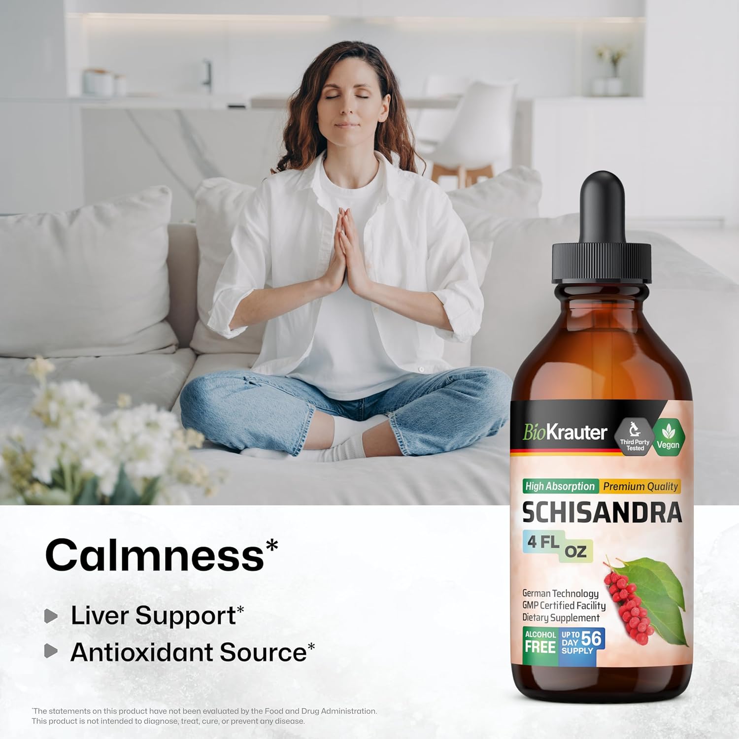 About this item Schisandra Tincture for Calmness: BioKrauter shisandra supplement, made from Schisandra chinensis (commonly known as schisandra berries), supports calmness and liver health. Vegan & Non-alcohol: Our schisandra berry tea extract is vegan, non-GMO, and free from alcohol, artificial colors, and flavors, designed to align with a wide range of lifestyles. The schisandra powder tincture is suitable for those who struggle with swallowing schisandra capsules. No Bitter Taste: Our schisandra tea extract is crafted with glycerin, which naturally eliminates bitterness, ensuring a smooth and pleasant flavor without the need for any added sugars. German Technology: We utilize German technology to craft schisandra herb supplements that naturally and effectively support your health. Made with only three simple ingredients: water, glycerin, and schizandra—this formula provides up to 98% absorption. Usage Instructions: Shake schisandra extract well before use. Our schisandra adaptogen extract is easy to use—simply add a few schisandra fruit drops to your favorite beverage or directly under the tongue. Avoid touching the dropper with your lips or tongue. › See more product details,Schisandra Tincture for Calmness: BioKrauter shisandra supplement, made from Schisandra chinensis (commonly known as schisandra berries), supports calmness and liver health,Vegan & Non-alcohol: Our schisandra berry tea extract is vegan, non-GMO, and free from alcohol, artificial colors, and flavors, designed to align with a wide range of lifestyles. The schisandra powder tincture is suitable for those who struggle with swallowing schisandra capsules,No Bitter Taste: Our schisandra tea extract is crafted with glycerin, which naturally eliminates bitterness, ensuring a smooth and pleasant flavor without the need for any added sugars,German Technology: We utilize German technology to craft schisandra herb supplements that naturally and effectively support your health. Made with only three simple ingredients: water, glycerin, and schizandra—this formula provides up to 98% absorption,Usage Instructions: Shake schisandra extract well before use. Our schisandra adaptogen extract is easy to use—simply add a few schisandra fruit drops to your favorite beverage or directly under the tongue. Avoid touching the dropper with your lips or tongue