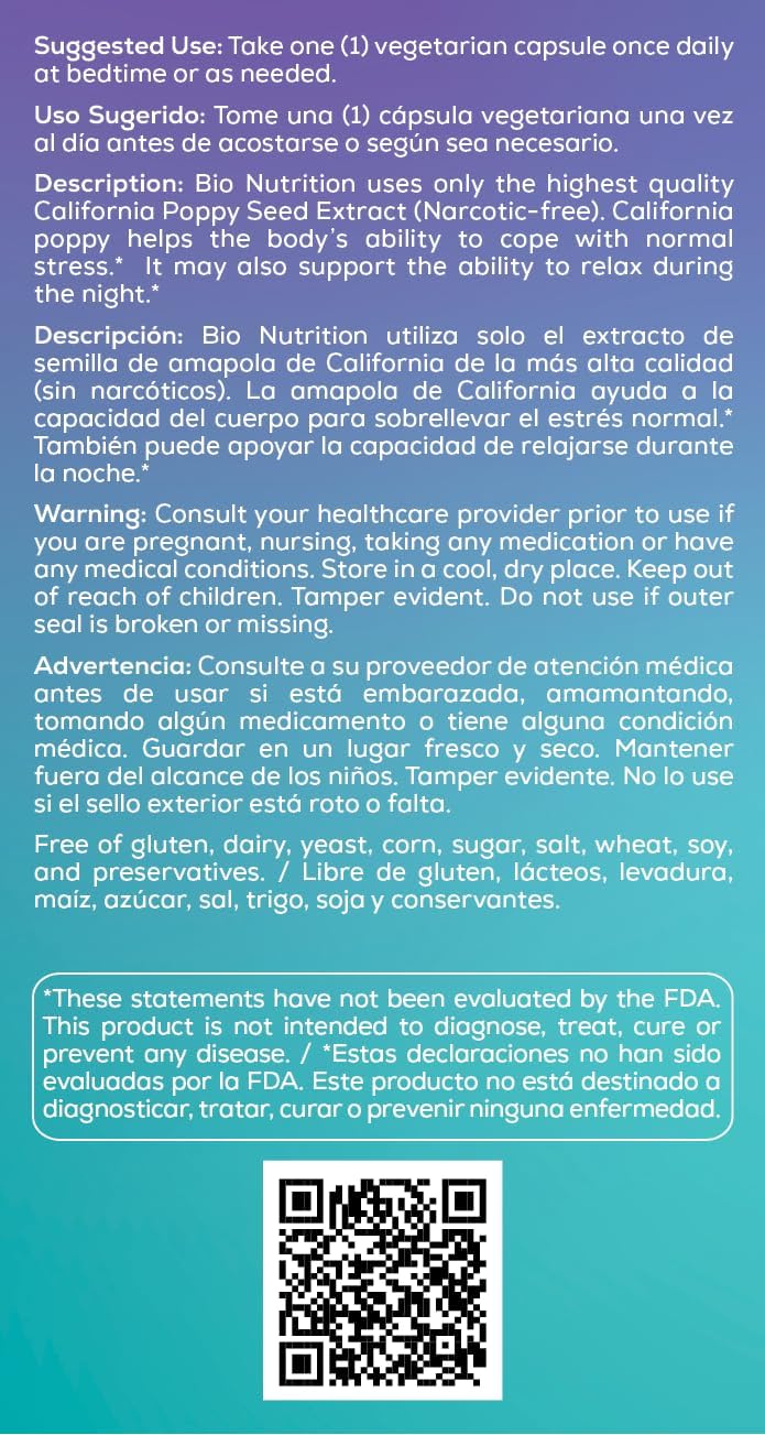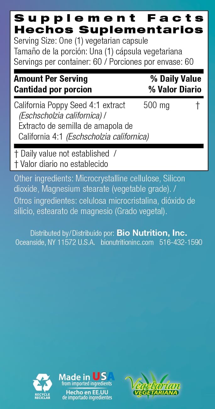 Bio Nutrition California Poppy Herbal Supplement 60 Vegetarian Capsules | Natural Relaxation & Stress Relief | Supports Calm Sleep & Mood