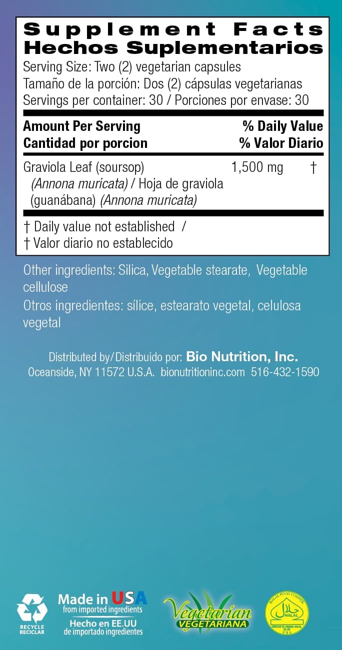 Bio Nutrition Graviola (Annona Muricata) 60 Vegetarian Capsules | 1,500 Mg Soursop | Supports Healthy Immune Fuction | Anti-Oxidant Properties | Positive Digestive Benefits