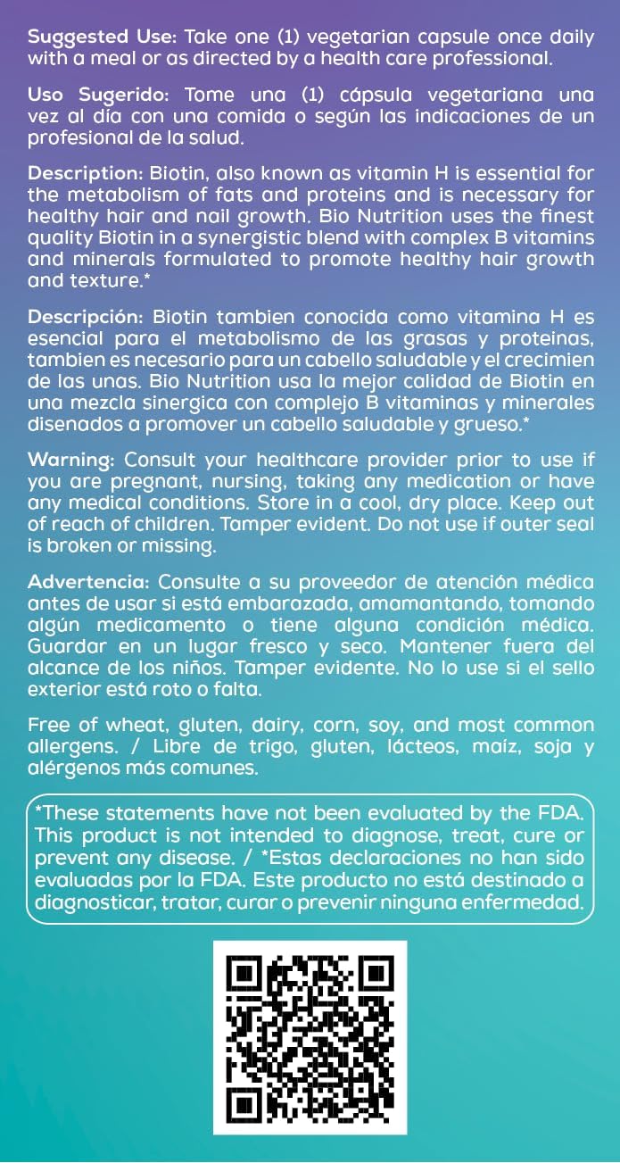 Bio Nutrition Healthy Hair Support With Biotin 60 Vegetarian Capsules | Stronger Hair | Thicker Hair | Promotes Hair Growth And Thickness | Blend With Complex B Vitamins And Minerals