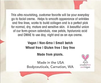 About this item Deeply Nourishing, Repairing Formula: A customer-favorite facial crème designed to hydrate, soothe, and repair normal, dry, mature, and sensitive skin with nature’s most powerful botanicals. Firms, Plumps & Reduces Fine Lines: Features hyaluronic acid to deeply hydrate and visibly plump skin, plus DMAE to promote skin firmness and improve the appearance of wrinkles. High Potency Calendula for Skin Repair: Contains the highest concentration of farm-grown calendula resins available in a face cream—supporting collagen and elastin rejuvenation for glowing, healthy skin. Multi-Use Moisturizer for Face & Eyes: Use as a daily moisturizer, night cream, and hydrating eye crème. Lightweight yet deeply moisturizing, it absorbs quickly without clogging pores. Clean, Conscious Skincare: Vegan, non-GMO, and free from gluten, soy, wheat, synthetic fragrances, and parabens. pH-balanced and packaged in a reusable 2 oz glass jar. Versatile Use: Ideal for day and night use, this crème also works wonderfully as an eye cream for comprehensive skincare. › See more product details,Deeply Nourishing, Repairing Formula: A customer-favorite facial crème designed to hydrate, soothe, and repair normal, dry, mature, and sensitive skin with nature’s most powerful botanicals,Firms, Plumps & Reduces Fine Lines: Features hyaluronic acid to deeply hydrate and visibly plump skin, plus DMAE to promote skin firmness and improve the appearance of wrinkles,High Potency Calendula for Skin Repair: Contains the highest concentration of farm-grown calendula resins available in a face cream—supporting collagen and elastin rejuvenation for glowing, healthy skin,Multi-Use Moisturizer for Face & Eyes: Use as a daily moisturizer, night cream, and hydrating eye crème. Lightweight yet deeply moisturizing, it absorbs quickly without clogging pores,Clean, Conscious Skincare: Vegan, non-GMO, and free from gluten, soy, wheat, synthetic fragrances, and parabens. pH-balanced and packaged in a reusable 2 oz glass jar,Versatile Use: Ideal for day and night use, this crème also works wonderfully as an eye cream for comprehensive skincare