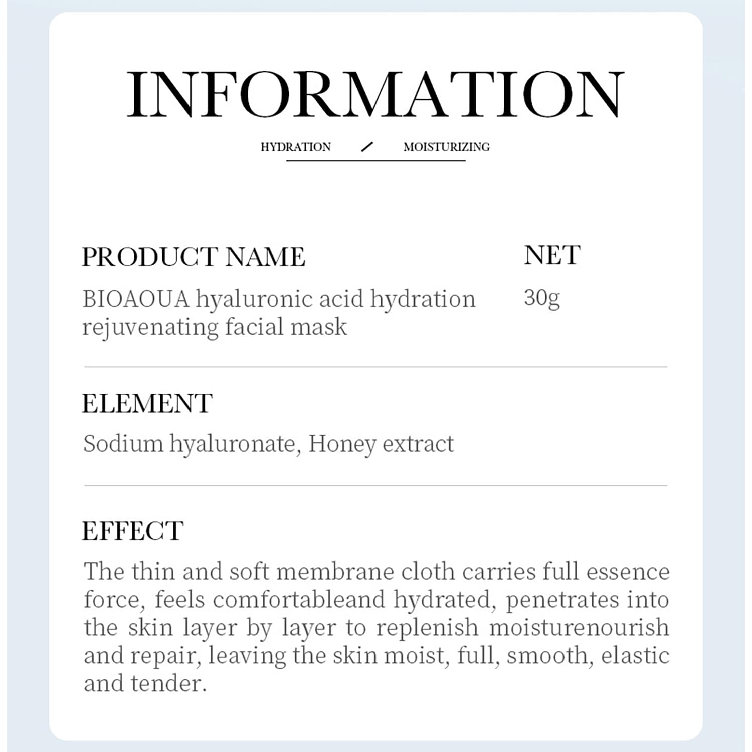 4. BIOAOUA moisturizing anti-aging face mask with hyaluronic acid. The thin and soft membrane fabric carries all the power of the essence, feels comfortable and moisturized, penetrates the skin layer by layer, replenishing moisture, nourishing and restoring, leaving the skin moist, full, smooth, elastic and tender