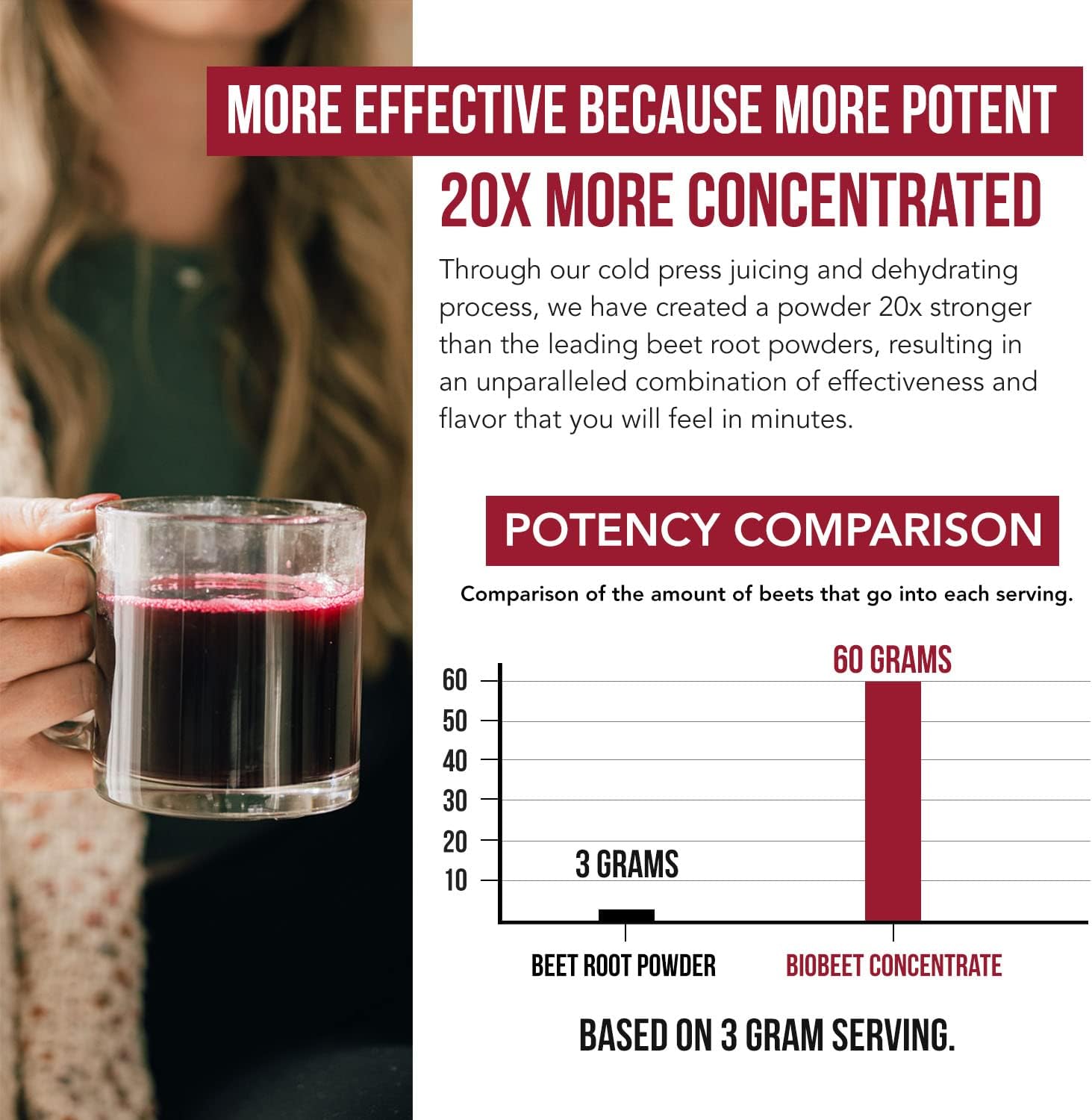 BULLET POINTS  :   1 >  MOST POTENT SOURCE 20:1 CONCENTRATE: BioBeet has a 20x higher concentration than standard beet root powder. It is a 20:1 beet juice concentrate, each 3 gram serving is derived from 60 grams of beets. In comparison standard beet powder which is 1:1 concentrate The 3 gram serving is derived from 3 grams of beets