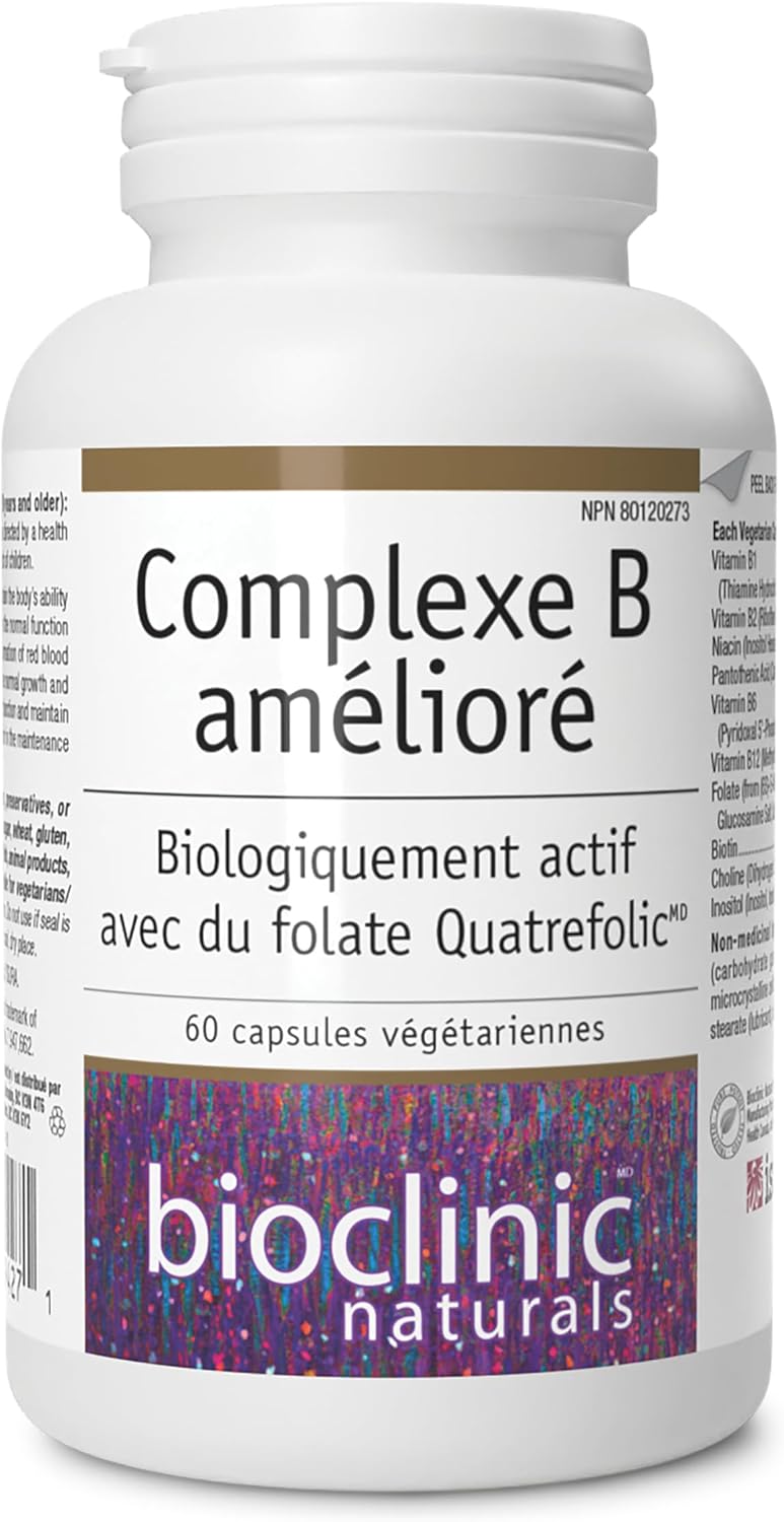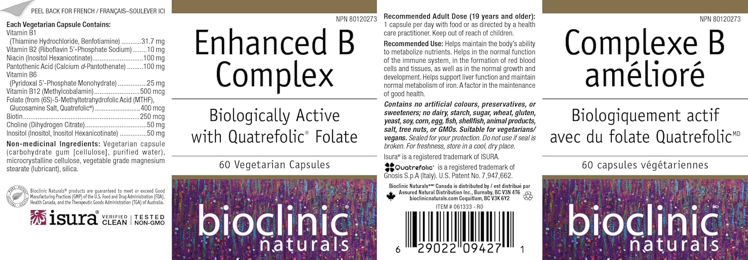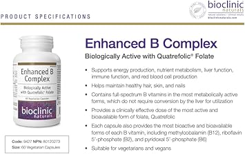 Bioclinic Naturals' Enhanced B Complex is a dietary supplement that provides full-spectrum B vitamins in their metabolically active forms