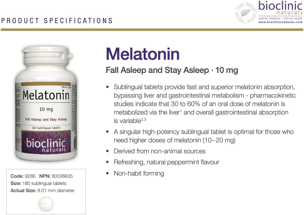Bioclinic Naturals Melatonin 180 Tablets contains 10 mg of melatonin per serving
