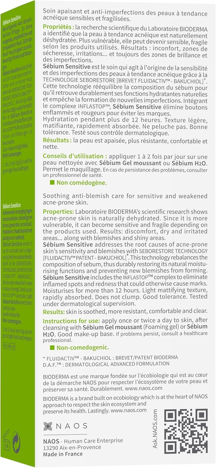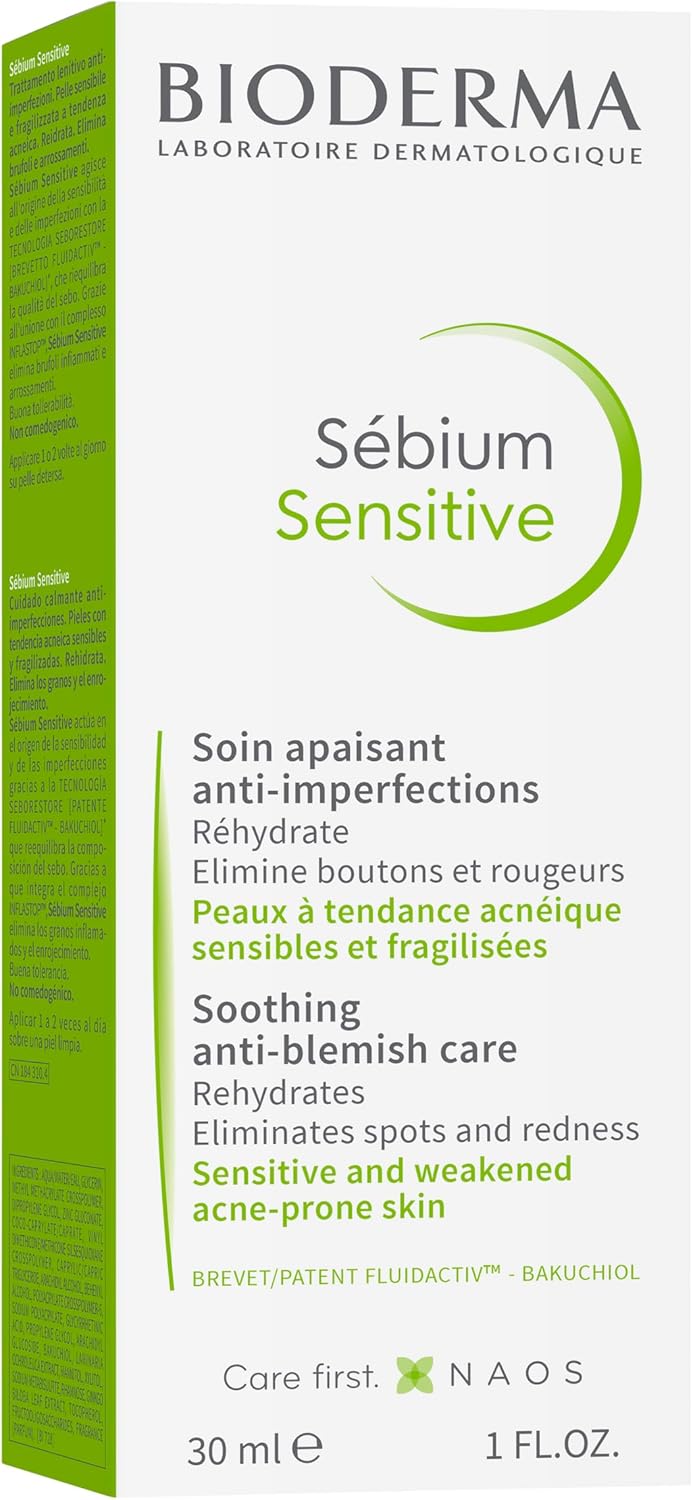 Bioderma Sébium Sensitive - Soothing Moisturiser For Acne Prone Skin, Face Cream Rhydrates Skin, Eliminates Spots & Reduces Redness, 30Ml