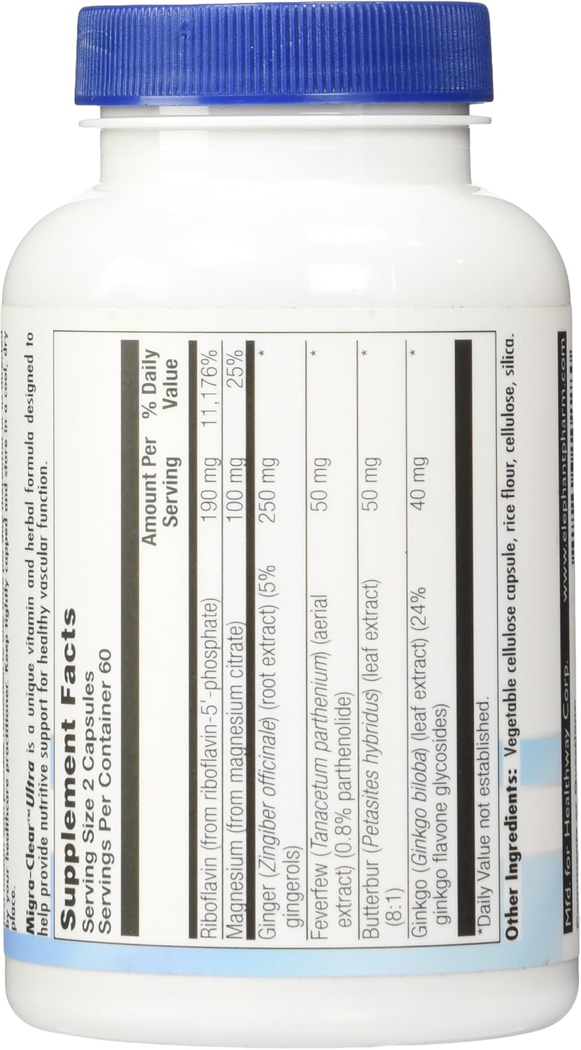 About this item VASCULAR SUPPORT: Designed to help support healthy capillary function, calm smooth muscles and maintain normal cytokine activity using a unique blend of Vitamin B2 (Riboflavin), Magnesium, Feverfew extract and Butterbur extract. PARTHENOLIDES: Features Feverfew extract standardized for the powerful compound parthenolide. Feverfew has been the subject of scientific research on its reputed ability to help maintain healthy prostaglandin balance, serotonin release and serum protease behavior. GINGEROL: Each serving of MigraClear Ultra provides 250 mg Ginger standardized extract. Gingerol, the main bioactive ingredient in ginger, may help support cytokine balancing and antioxidant effects in the body. BUTTERBUR: Formulated to contain Sesquiterpenes from Butterbur, which has been scientifically studied for its reputed benefits on maintaining healthy leukotriene and prostaglandin balance as well as smooth muscle and vascular wall tone. PURITY: 100% free of magnesium stearate and stearic acid. › See more product details,VASCULAR SUPPORT: Designed to help support healthy capillary function, calm smooth muscles and maintain normal cytokine activity using a unique blend of Vitamin B2 (Riboflavin), Magnesium, Feverfew extract and Butterbur extract,PARTHENOLIDES: Features Feverfew extract standardized for the powerful compound parthenolide. Feverfew has been the subject of scientific research on its reputed ability to help maintain healthy prostaglandin balance, serotonin release and serum protease behavior,GINGEROL: Each serving of MigraClear Ultra provides 250 mg Ginger standardized extract. Gingerol, the main bioactive ingredient in ginger, may help support cytokine balancing and antioxidant effects in the body,BUTTERBUR: Formulated to contain Sesquiterpenes from Butterbur, which has been scientifically studied for its reputed benefits on maintaining healthy leukotriene and prostaglandin balance as well as smooth muscle and vascular wall tone,PURITY: 100% free of magnesium stearate and stearic acid