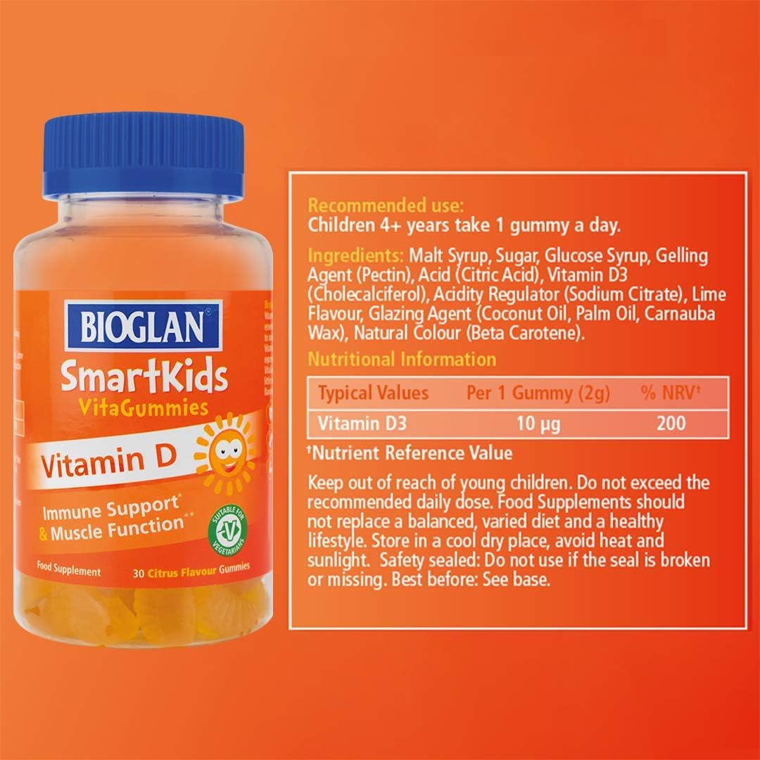 Product Description Bioglan Smartkids Vitamin D Vitagummies - 30 Citrus Gummies Ingredients Glucose Syrup, Sugar, Dextrose, Gelling Agent: Pectin, Acid: Citric Acid, Vitamin D3 (Cholecalciferol), Acidity Regulator: Sodium Citrate, Lime Flavouring, Vegetable Oils (Coconut, Palm), Glazing Agent: Carnauba Wax, Colour: Beta-carotene,SmartKids Vitamin D gummies provide children with a daily dose of the sunshine Vitamin,Vitamin D is an important nutrient & some children may not get enough due to lack of sunshine in some countries therefore a supplement may be required to top up these levels,Each gummy provides 200% Nutrient Reference Value (NRV) of Vitamin D3