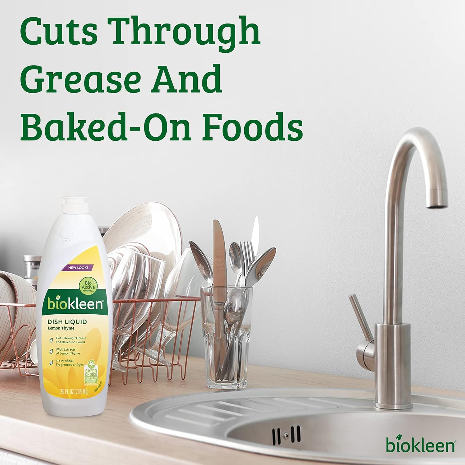 For a sink full of dirty dishes, it's Biokleen to the rescue. Our Dish Liquid Soap provides an invigorating scent of Lemon Thyme and cuts through the toughest grease and burnt-on foods. We never use phosphates, chlorine, ammonia, brighteners or artificial colors and fragrance to make this product, leaving you with a family-safe detergent to take care of all your dishes. Biokleen products are highly concentrated to reduce packaging, waste and energy use. Proudly manufactured in the U.S. and made with a commitment to people, pets and our planet, this 2-pack of Lemon Thyme Dish Liquid is Safer Choice Certified to make it easier than ever to keep all your dishes sparkling clean. If you have any questions, please don't hesitate to reach out,EFFECTIVE PLANT-BASED DISH WASHING SOLUTION: Biokleen uses natural, plant based solutions in its commitment to planet Earth. This product is Safer Choice Certified,CLEANER DISHES: Biokleen's Free and Clear Liquid Dish Soap cuts through grease and burned-on foods to make cleaning your dishes easy,PLANT-BASED PRODUCT: Biokleen Liquid Dish Soap contains no phosphate, chlorine, ammonia or artificial fragrances and dyes,SPOT-FREE RESULTS: Dishes rinse easily without any residue or spots left behind,MADE IN THE USA: We use biodegradable ingredients, never test on animals, and are manufactured in the USA with US and imported parts