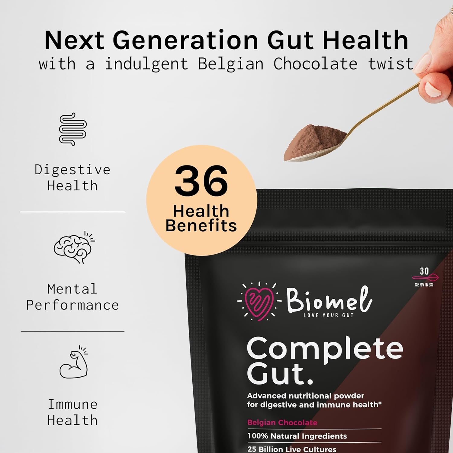 Biomel Complete Gut - Belgian Chocolate - Advanced Gut Health - 450G/30 Servings - Vegan Friendly - Gluten Free - Delicious & Effective