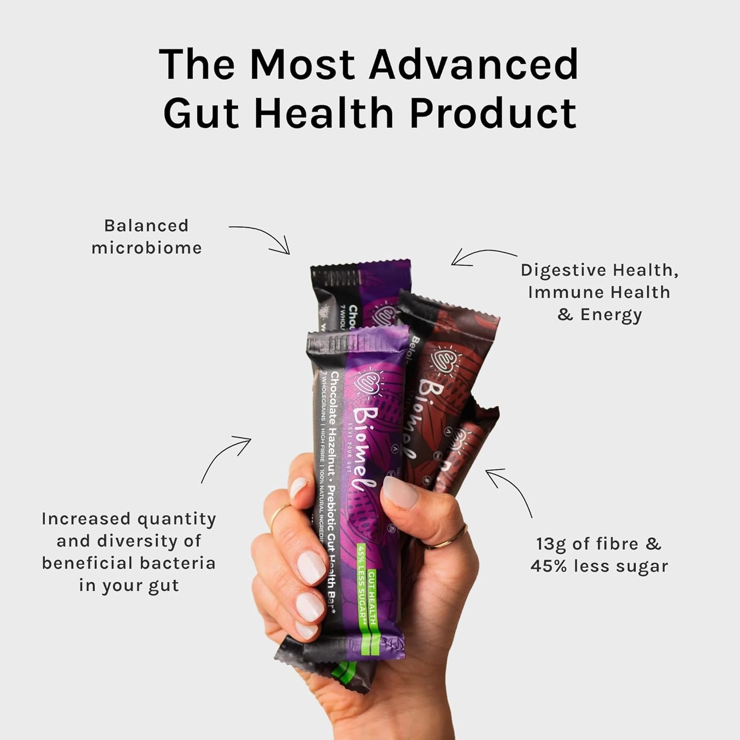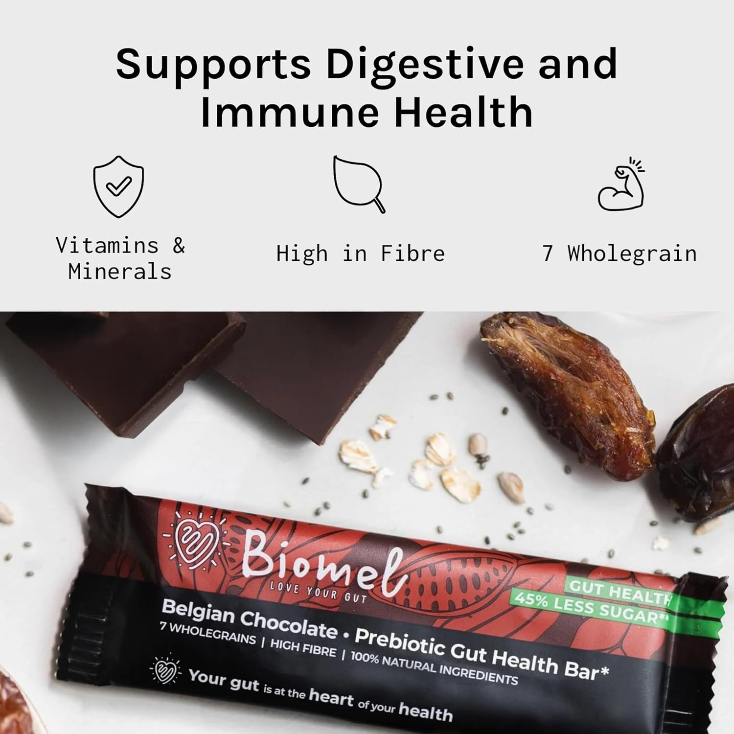Biomel Prebiotic Gut Health Bars - Natural Ingredients - High Fibre - 45% Less Sugar - 12 Bars (Belgian Chocolate)