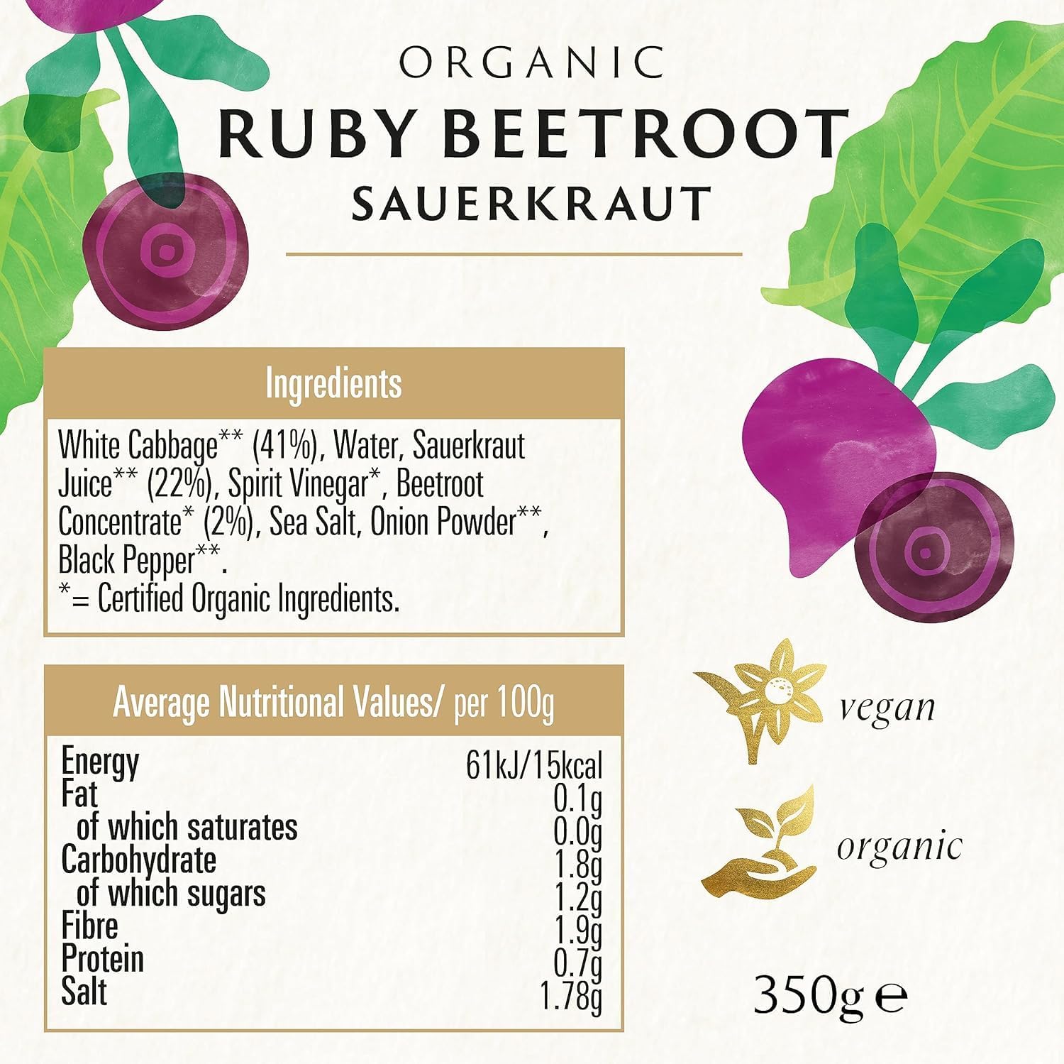 About The Product : Biona Organic Ruby Sauerkraut is made by combining carefully shredded cabbage and beetroot. This Sauerkraut will liven up all your favourite meals - pair with salads, hummus wraps, veggie burgers, grilled vegetables and more