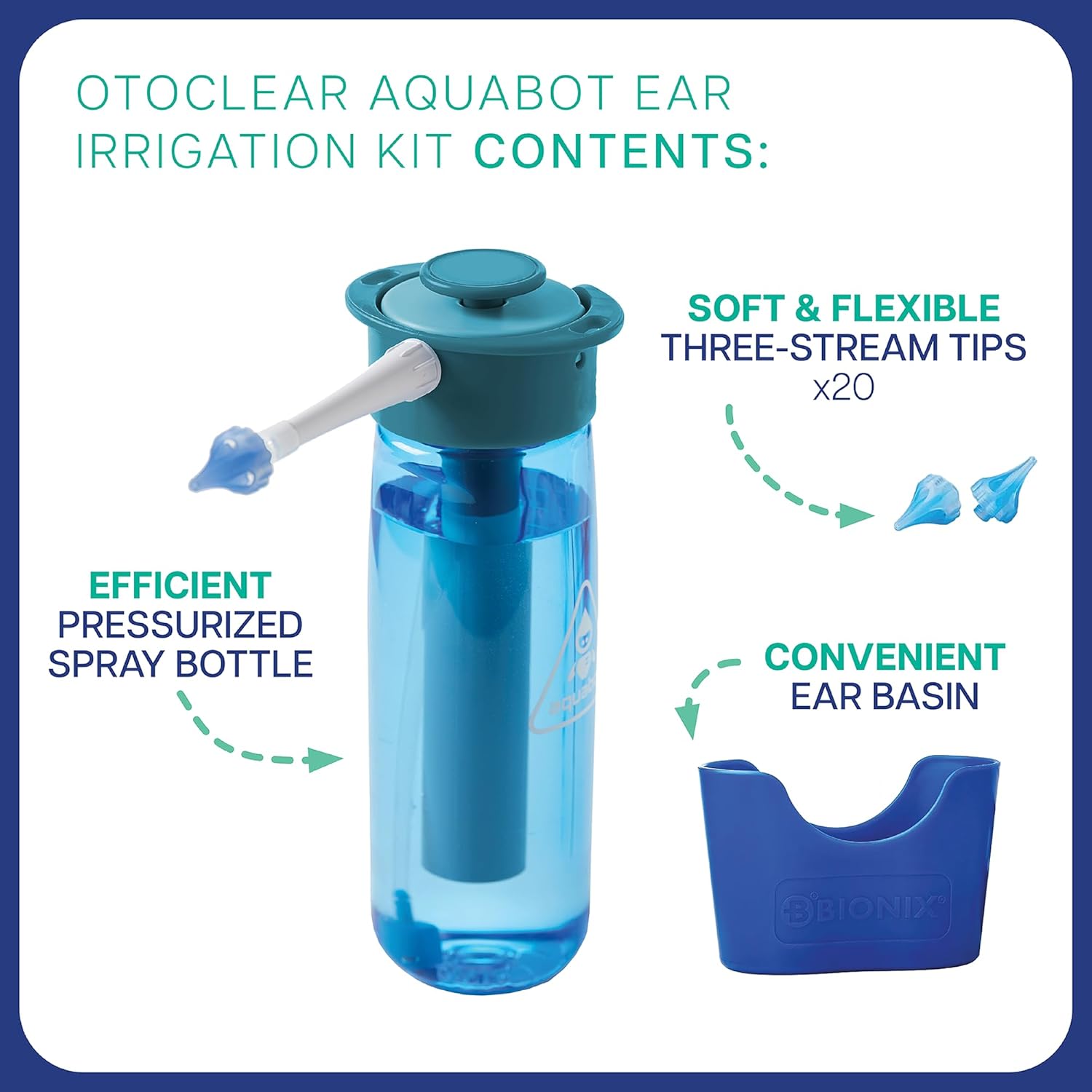 About this item INCLUDED IN THIS KIT: (20) OtoClear Tips, (1) Aquabot Bottle, & (1) Ear Basin SAFE: This ear irrigation kit utilizes flared ear irrigation tips that direct water toward the ear canal wall with three divergent streams, effectively irrigating without damaging the eardrum. EFFICIENT DESIGN: The Aquabot bottle delivers a larger volume than syringes and other manual devices. Its pressurized bottle design allows health care professionals to provide a continuous stream without continual manual pumping. NO BACKSPLASH: Our Aquabot irrigation tips are designed to direct water into the ear canal, without messy splashing. This cleanly & safely removes excess cerumen from the ear canal. WHO WE SERVE: Bionix provides quality healthcare products that are designed for all medical professionals, from pediatricians to home healthcare specialists to help better the lives of patients in every developmental stage. - Made in America - › See more product details,INCLUDED IN THIS KIT: (20) OtoClear Tips, (1) Aquabot Bottle, & (1) Ear Basin,SAFE: This ear irrigation kit utilizes flared ear irrigation tips that direct water toward the ear canal wall with three divergent streams, effectively irrigating without damaging the eardrum,EFFICIENT DESIGN: The Aquabot bottle delivers a larger volume than syringes and other manual devices. Its pressurized bottle design allows health care professionals to provide a continuous stream without continual manual pumping,NO BACKSPLASH: Our Aquabot irrigation tips are designed to direct water into the ear canal, without messy splashing. This cleanly & safely removes excess cerumen from the ear canal,WHO WE SERVE: Bionix provides quality healthcare products that are designed for all medical professionals, from pediatricians to home healthcare specialists to help better the lives of patients in every developmental stage. - Made in America -