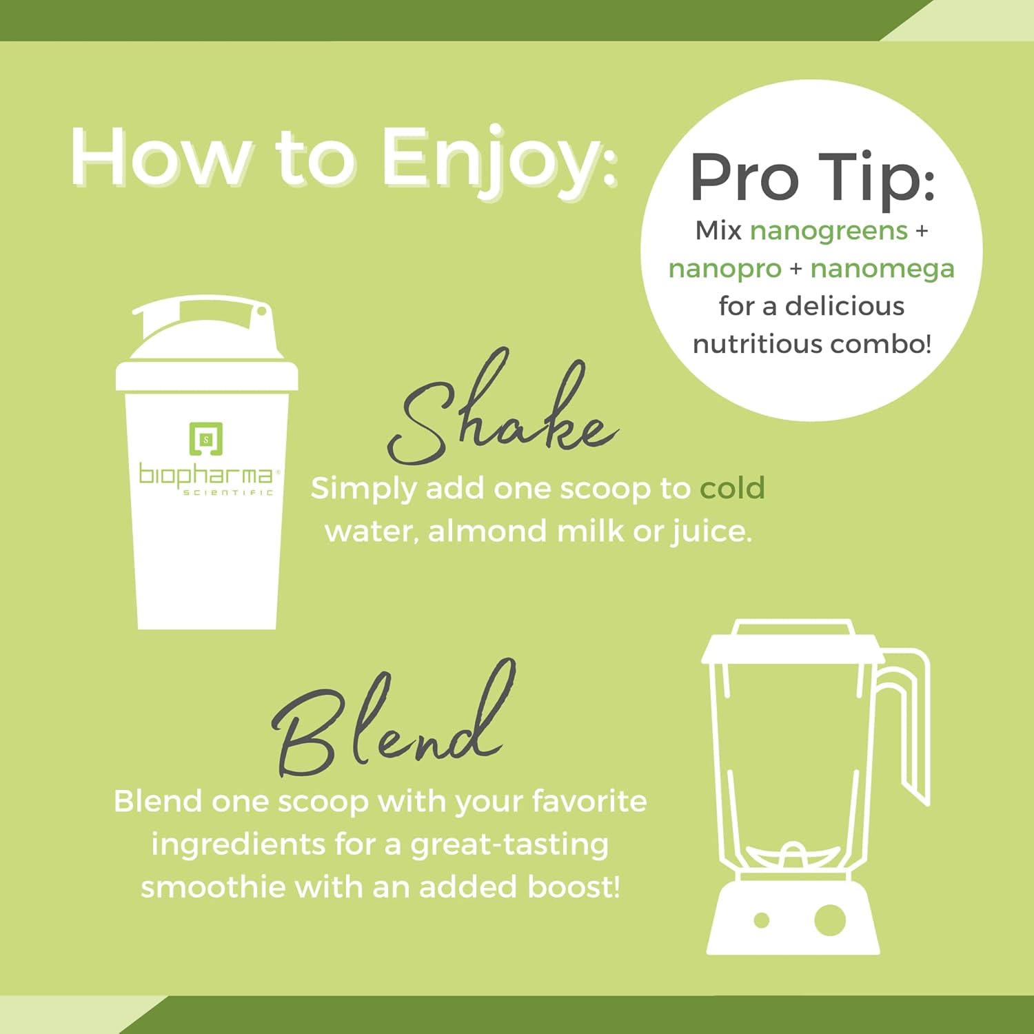 EASY TO ENJOY: Mix 1 scoop of Nanomega with 6-8 oz. of cold water. Shake briskly or blend. We love to take ours first thing in the morning to alkalize, energize and give you what you need to get the day started. Try mixing with Nanopro and Nanogreens to get a nice fruity flavor. Or, try mixing with unsweetened almond milk, coconut milk or add it to a smoothie