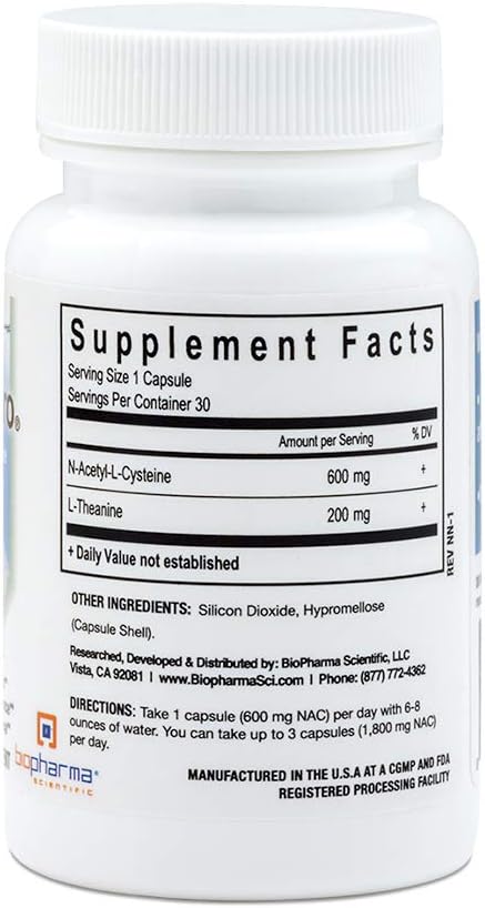 About this item SCIENCE BASED: provides brain-boosting benefits to support memory, focus, cognitive function, and mood ENHANCED BIOAVAILABILITY: Our Nanoneuro product is NAC (N-Acetylcysteine) + L-Theanine HEALTH BENEFITS: enhance the clarity of thinking, alertness, focus and concentration THE PUREST SOURCE: L-Theanine is an amino acid found in green tea which energizes, calms, and motivates the brain EASY TO ENJOY: Take 1 capsule (600 mg NAC) per day with 6-8 ounces of water. You can take up to 3 capsules (1,800 mg NAC) per day › See more product details,SCIENCE BASED: provides brain-boosting benefits to support memory, focus, cognitive function, and mood,ENHANCED BIOAVAILABILITY: Our Nanoneuro product is NAC (N-Acetylcysteine) + L-Theanine,HEALTH BENEFITS: enhance the clarity of thinking, alertness, focus and concentration,THE PUREST SOURCE: L-Theanine is an amino acid found in green tea which energizes, calms, and motivates the brain,EASY TO ENJOY: Take 1 capsule (600 mg NAC) per day with 6-8 ounces of water. You can take up to 3 capsules (1,800 mg NAC) per day