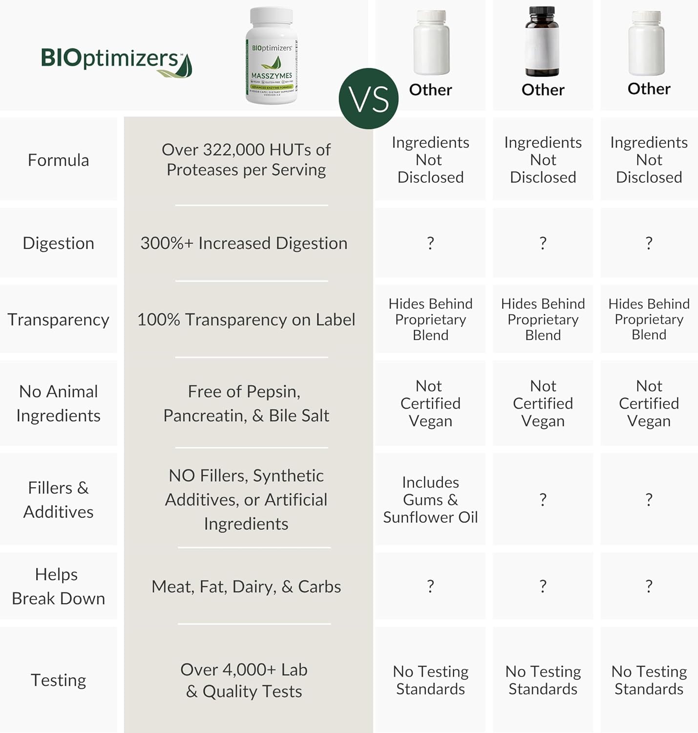 About this item Powerful Digestive Support: MassZymes delivers 320,000 units of protein-digesting enzymes (bromelian, amylase, lipase, protease) per capsule, optimizing digestion, reducing bloating, and maximizing nutrient absorption for better gut health Boost Energy & Clarity: Improve digestion, reduce sluggishness, and unlock sustained energy. Enhanced nutrient absorption supports sharpness and helps you feel lighter and more energized Faster Muscle Recovery: Designed for athletes and high-performers, MassZymes accelerates muscle repair and reduces soreness by maximizing protein breakdown for quicker recovery and peak performance using bromelian, amylase, lipase, and protease Gut Health & Immunity: Combat gas, indigestion, and food sensitivities with a full-spectrum enzyme blend of bromelian, amylase, lipase, and protease that supports a healthy gut barrier and promotes balanced immune response Clean, Potent Formula: 100% plant-based and vegan-friendly, with no dairy, soy, or fillers. Each capsule works in any stomach environment, ensuring effective digestion from start to finish › See more product details,Powerful Digestive Support: MassZymes delivers 320,000 units of protein-digesting enzymes (bromelian, amylase, lipase, protease) per capsule, optimizing digestion, reducing bloating, and maximizing nutrient absorption for better gut health,Boost Energy & Clarity: Improve digestion, reduce sluggishness, and unlock sustained energy. Enhanced nutrient absorption supports sharpness and helps you feel lighter and more energized,Faster Muscle Recovery: Designed for athletes and high-performers, MassZymes accelerates muscle repair and reduces soreness by maximizing protein breakdown for quicker recovery and peak performance using bromelian, amylase, lipase, and protease,Gut Health & Immunity: Combat gas, indigestion, and food sensitivities with a full-spectrum enzyme blend of bromelian, amylase, lipase, and protease that supports a healthy gut barrier and promotes balanced immune response,Clean, Potent Formula: 100% plant-based and vegan-friendly, with no dairy, soy, or fillers. Each capsule works in any stomach environment, ensuring effective digestion from start to finish
