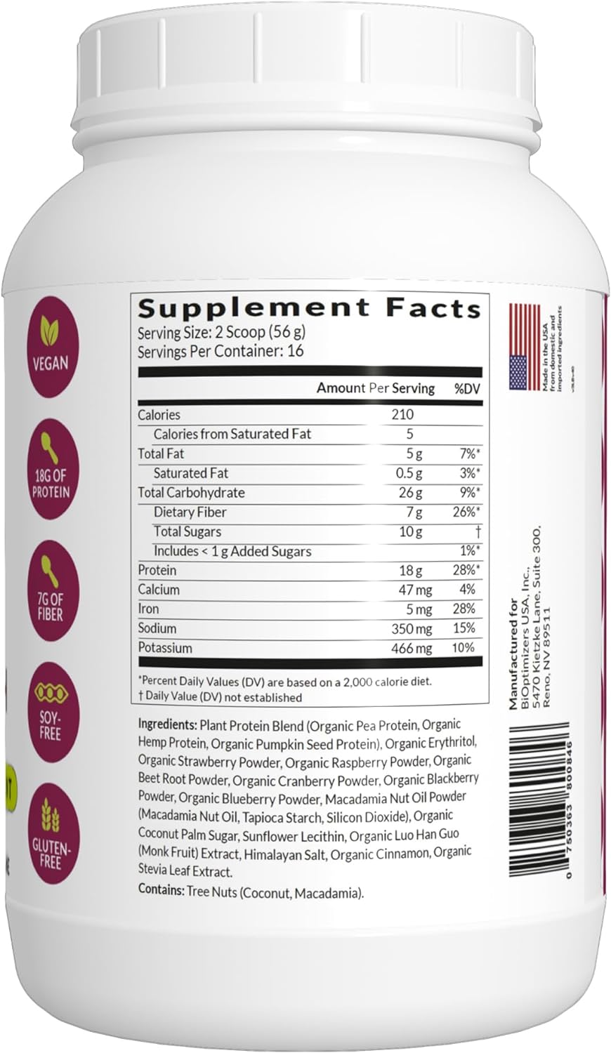 DESCRIPTION : BiOptimizers Protein Breakthrough - Plant-Based Protein Blend (from Pea, Hemp, Pumpkin Seed) - Berry Flavor (907g) - Vegan, Low-carb, Low-glycemic, Soy-Free, Gluten-Free