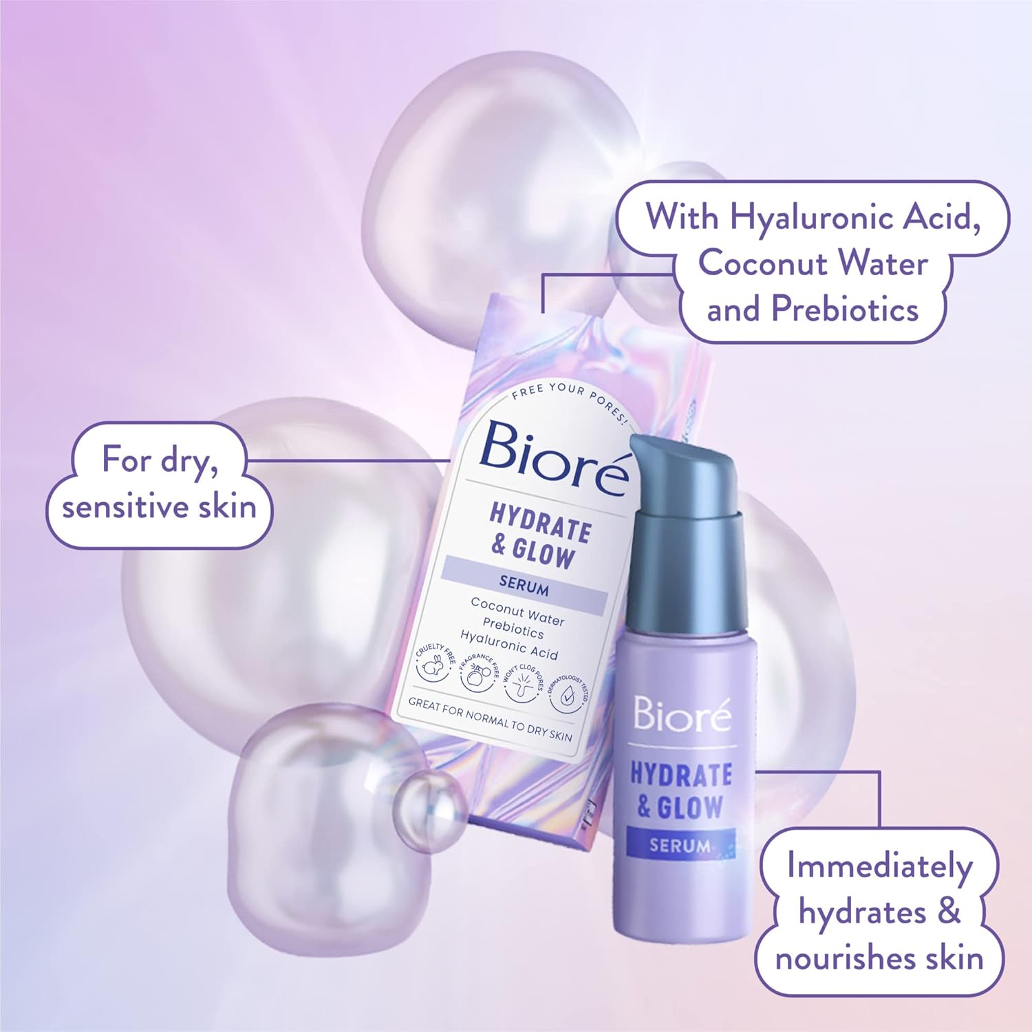 Bioré Hydrate & Glow Face Serum For Dry, Sensitive Skin With Hyaluronic Acid, Coconut Water And Prebiotics, Dermatologist Tested Face Serum, Fragrance Free, Not Tested On Animals, 1 Oz Bottle