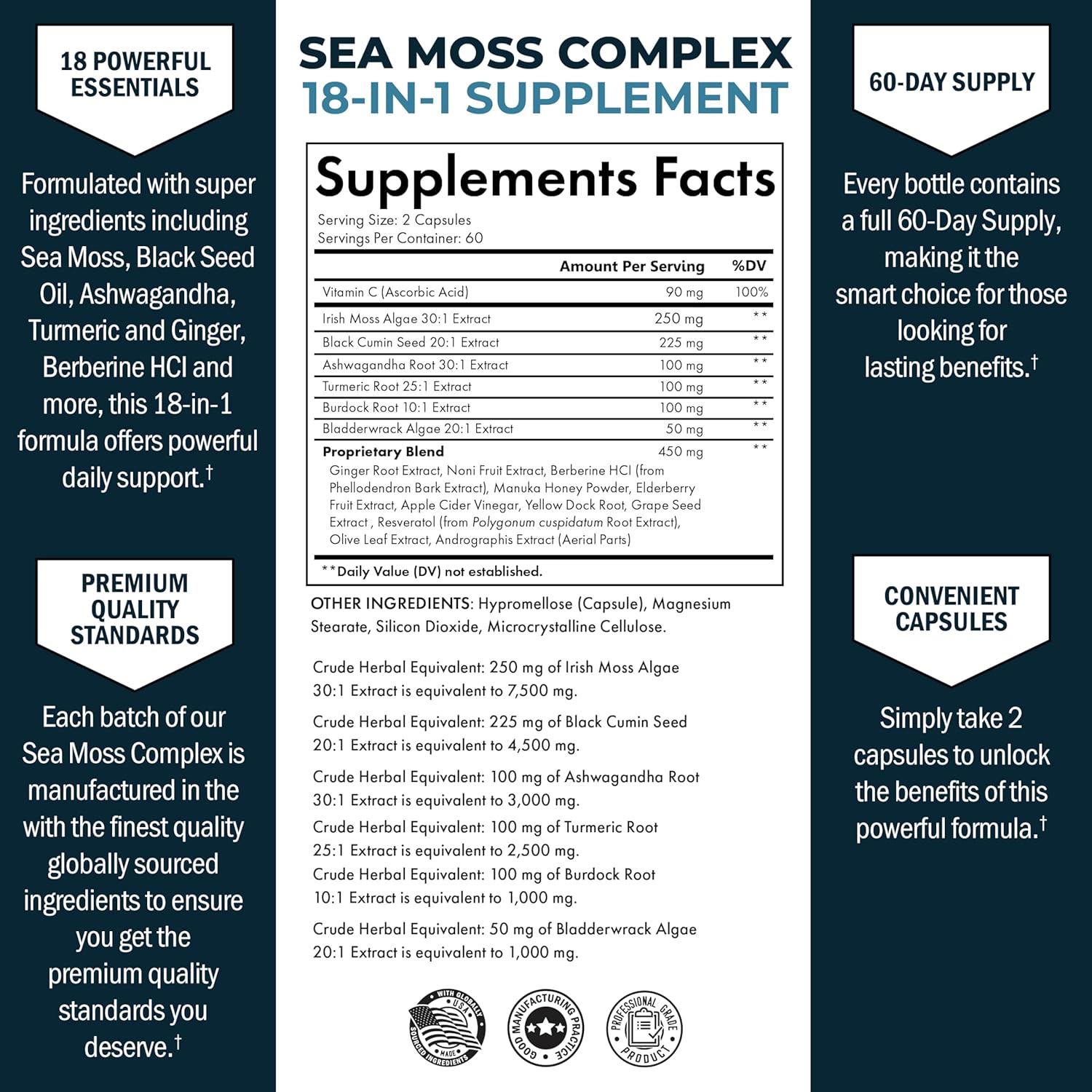 About this item Transform Your Wellness Routine: This advanced sea moss black seed oil ashwagandha ginger formula offers a powerful combination of 18 potent ingredients designed to support whole body wellness - imagine enjoying improved hair, skin, and nails thanks to the sea moss enriched with black seed oil, all while supporting your body's movement and gut health with turmeric and ginger - it's the ultimate support your body deserves, conveniently packed into one daily serving Nutrient-Packed Sea Moss Capsules Supplement: Enjoy the convenience of having 18 key ingredients including Irish sea moss, black seed oil, and bladderwrack, all in a single capsule - this smart blend provides essential nutrients and multiminerals, eliminating the need for multiple supplements - imagine the ease of boosting your wellness effortlessly every day with just one sea moss supplement, enhancing your vitality and maintaining your daily balance with minimal effort 60-Day Supply in Every Bottle: With a 2-month supply in every bottle, this sea moss capsules supplement offers a long-lasting, cost-effective solution to supporting your health - designed for both women and men, each capsule is a step towards holistic well-being, combining the benefits of ashwagandha and apple cider vinegar - this means consistent support for your body's systems, ensuring that your well-being remains a priority Support Your Active Lifestyle: This packed sea moss supplement also includes burdock root and ginger, catering to those with an active lifestyle who need extra support for movement and digestion - Feel the difference as your body moves more freely, supported by the powerful nutrients found in these complete seamoss capsules, enhancing your flexibility and making every activity more enjoyable for both men and women Robust Immune Support: Harness the power of seamoss black seed oil ashwagandha ginger in our premium capsules to strengthen your body's natural defenses; this potent blend, enriched with elderberry and manuka honey powder, delivers immune support properties that help support your health › See more product details,Transform Your Wellness Routine: This advanced sea moss black seed oil ashwagandha ginger formula offers a powerful combination of 18 potent ingredients designed to support whole body wellness - imagine enjoying improved hair, skin, and nails thanks to the sea moss enriched with black seed oil, all while supporting your body's movement and gut health with turmeric and ginger - it's the ultimate support your body deserves, conveniently packed into one daily serving,Nutrient-Packed Sea Moss Capsules Supplement: Enjoy the convenience of having 18 key ingredients including Irish sea moss, black seed oil, and bladderwrack, all in a single capsule - this smart blend provides essential nutrients and multiminerals, eliminating the need for multiple supplements - imagine the ease of boosting your wellness effortlessly every day with just one sea moss supplement, enhancing your vitality and maintaining your daily balance with minimal effort,60-Day Supply in Every Bottle: With a 2-month supply in every bottle, this sea moss capsules supplement offers a long-lasting, cost-effective solution to supporting your health - designed for both women and men, each capsule is a step towards holistic well-being, combining the benefits of ashwagandha and apple cider vinegar - this means consistent support for your body's systems, ensuring that your well-being remains a priority,Support Your Active Lifestyle: This packed sea moss supplement also includes burdock root and ginger, catering to those with an active lifestyle who need extra support for movement and digestion - Feel the difference as your body moves more freely, supported by the powerful nutrients found in these complete seamoss capsules, enhancing your flexibility and making every activity more enjoyable for both men and women,Robust Immune Support: Harness the power of seamoss black seed oil ashwagandha ginger in our premium capsules to strengthen your body's natural defenses; this potent blend, enriched with elderberry and manuka honey powder, delivers immune support properties that help support your health