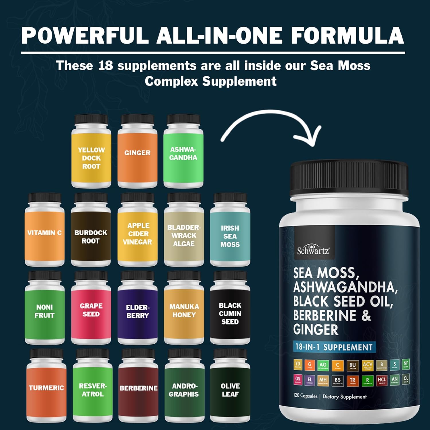 Bioschwartz Sea Moss Black Seed Oil Ashwagandha Ginger Supplement With Turmeric Berberine Hci Burdock Bladderwrack Resveratrol Elderberry Manuka Honey Apple Cider Vinegar Acv - 120 Sea Moss Capsules