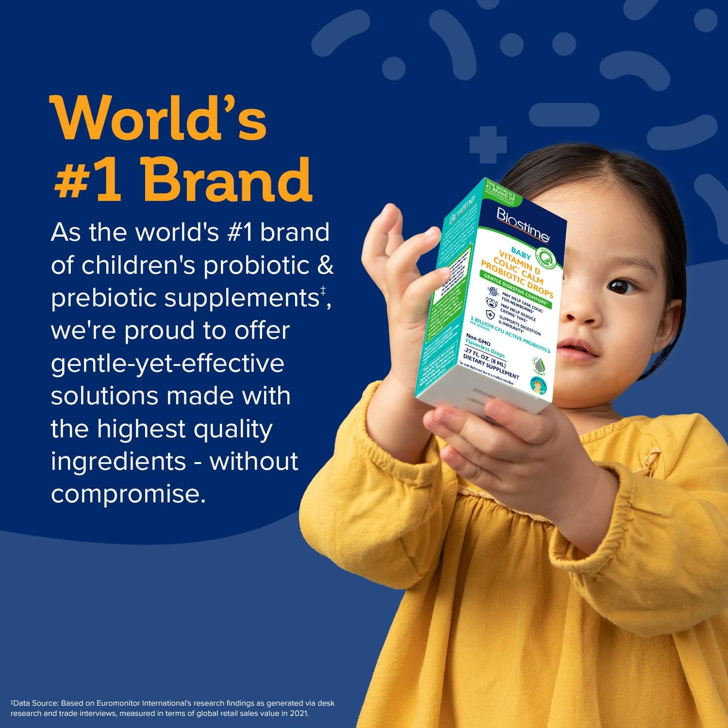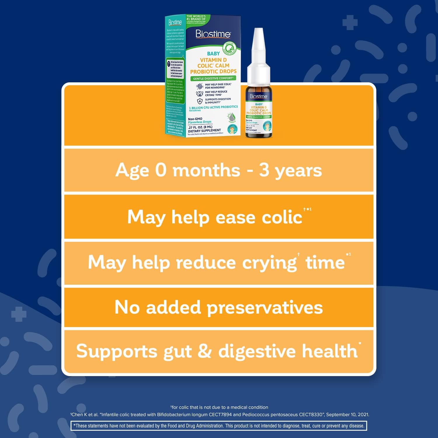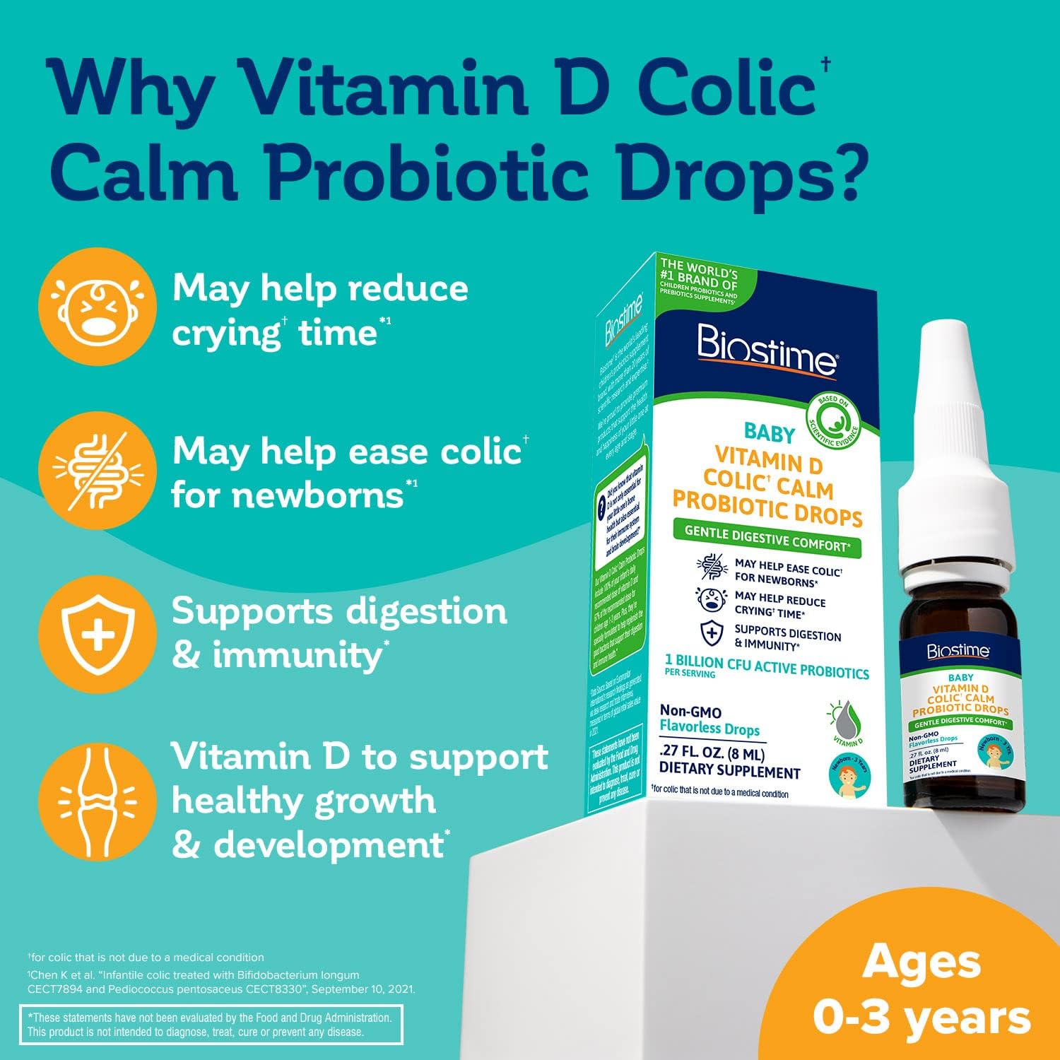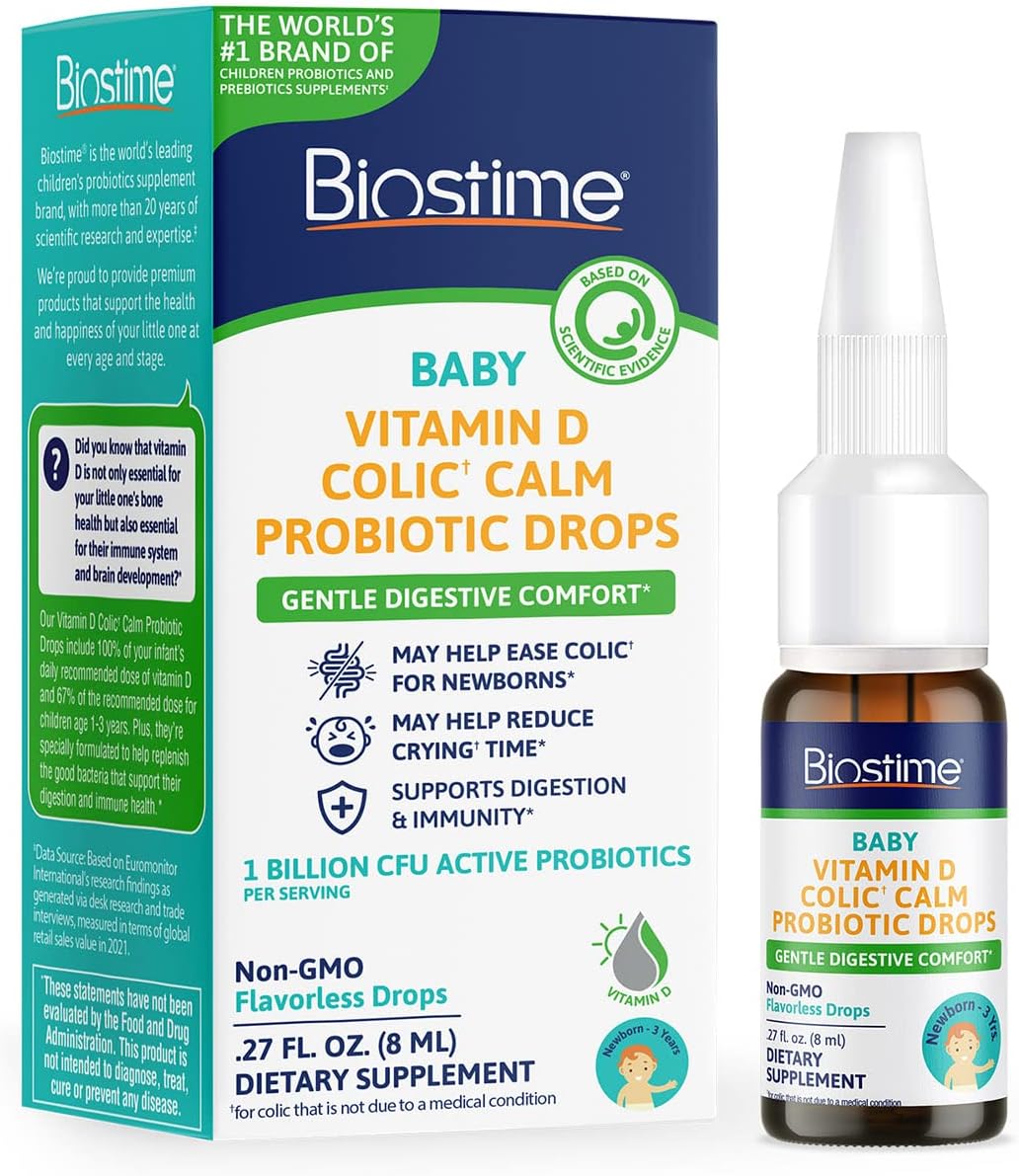 [BABY & NEWBORN GAS DROPS + KIDS PROBIOTICS] Flavorless Vitamin D colic calm probiotic drops help support calcium absorption. * Probiotic drops are suitable for newborns, infants and toddlers (Ages 0-3)10[COLIC CALM] Scientifically formulated to provide gentle and effective relief, may help to ease colic in newborns while supporting digestive comfort for your baby. * Our baby probiotic may help alleviate stomach and digestive discomfort10[SCIENTIFICALLY PROVEN TO REDUCE CRYING TIME] Our Vitamin D Colic Calm baby drops with probiotics reduce crying time caused by an occasional upset tummy, including symptoms associated with colic10[BABY PROBIOTIC DROPS DESIGNED WITH YOU IN MIND] Vitamin D supports strong bones, healthy development, and immune support for babies. * Non-GMO. Gluten-Free. Wheat-Free. Peanut-Free. Dairy-Free. Egg-free. Milk-free. No added preservatives10[EASY TO USE] Liquid supplement, unflavored, kids vitamin D drops may be placed on breast, or mixed with breast milk. These vitamin drops can also be mixed with baby formula, juice, or in food (room temperature or cooler)